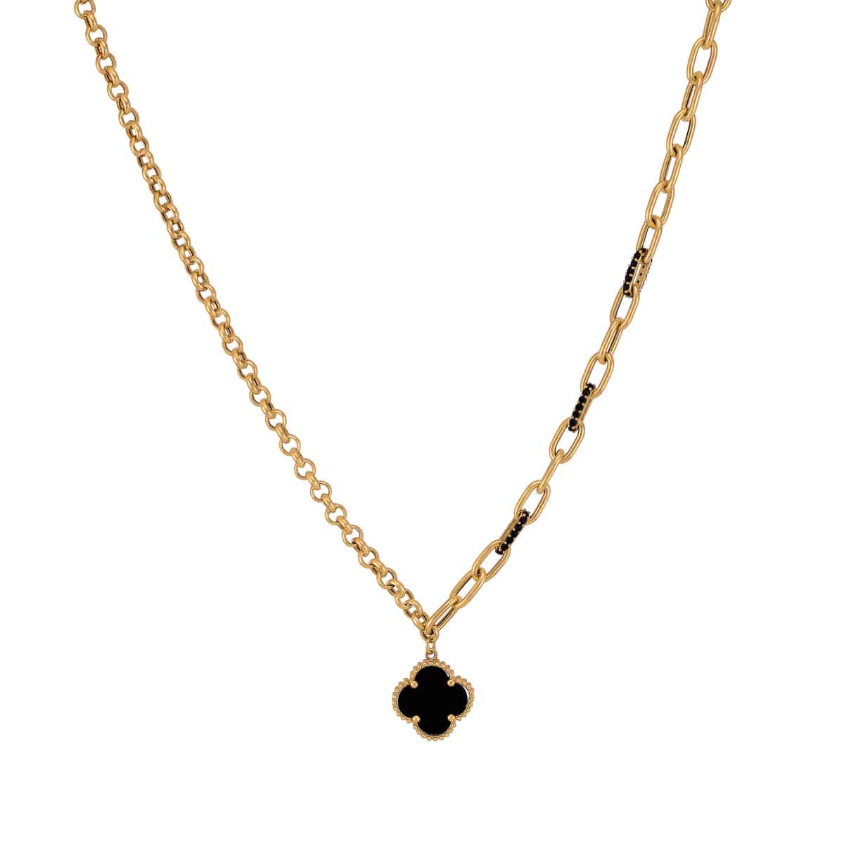 Naszyjnik wykonany jest z najwyższej jakości żółtego złota, które emanuje ciepłym, luksusowym blaskiem. Dwuzłożony łańcuszek o unikalnym splocie podkreśla jego wyjątkowy styl. Centralnym punktem naszyjnika jest wisząca marokańska koniczynka, subtelnie wykończona czarnymi cyrkoniami, które dodają mu głębi i tajemniczego uroku. Proporcje są idealnie zbalansowane, co czyni ten naszyjnik doskonałym dopełnieniem każdej stylizacji.