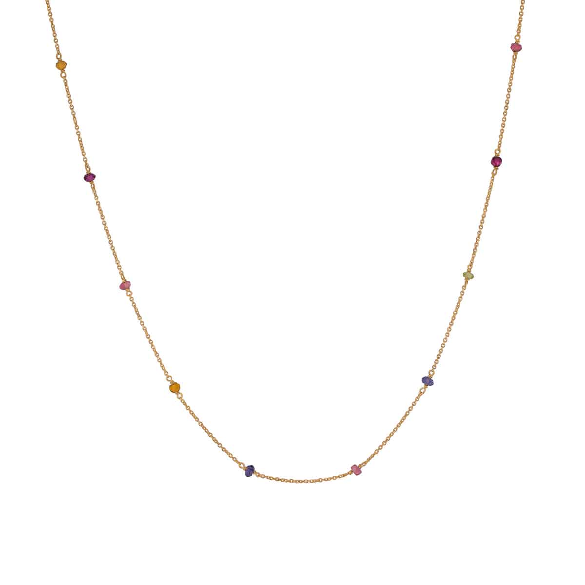 Delikatny naszyjnik wykonany z ciepłego żółtego złota przyciąga wzrok swoją elegancką prostotą. Na cienkim łańcuszku umieszczone są różnokolorowe cyrkonie, które mienią się w świetle, dodając całości wyjątkowego uroku. Każda cyrkonia jest starannie osadzona, tworząc harmonijną kompozycję kolorów – od głębokiego fioletu przez intensywną czerwień aż po świeżą zieleń. Dzięki temu naszyjnik jest zarówno klasyczny, jak i nowoczesny.
