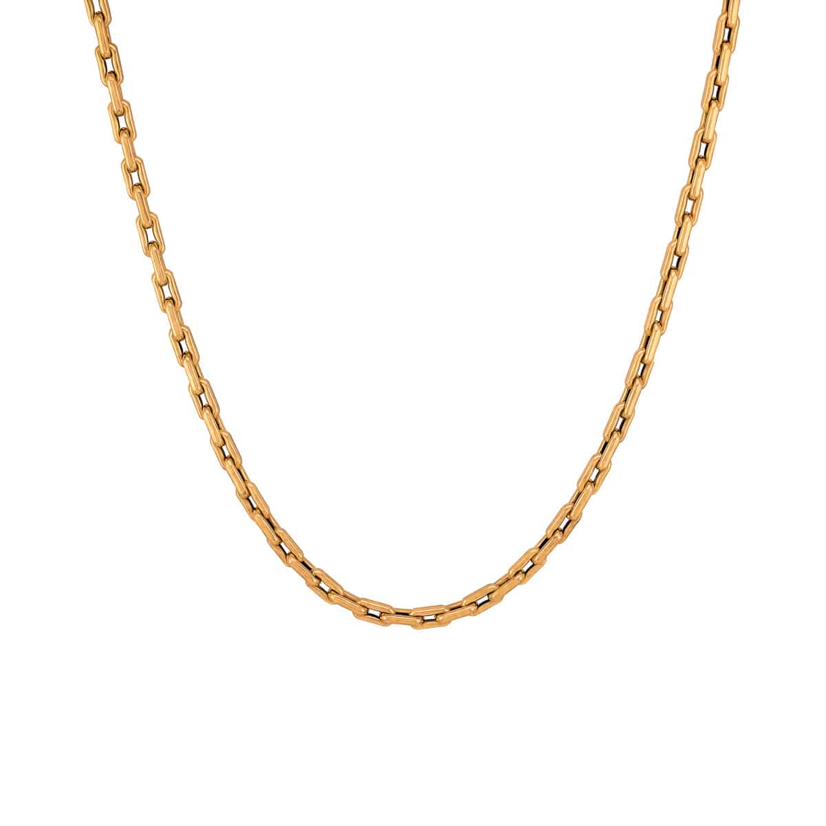 Naszyjnik wykonany jest z żółtego złota o ciepłym, bogatym odcieniu, który doskonale komponuje się z różnorodnymi kreacjami. Ogniwa łańcucha mają klasyczny, prostokątny kształt, co nadaje całości nowoczesnego, a zarazem eleganckiego charakteru. Subtelna faktura powierzchni dodaje głębi i podkreśla precyzję wykonania, sprawiając, że naszyjnik jest nie tylko piękny, ale i wyjątkowo trwały.
