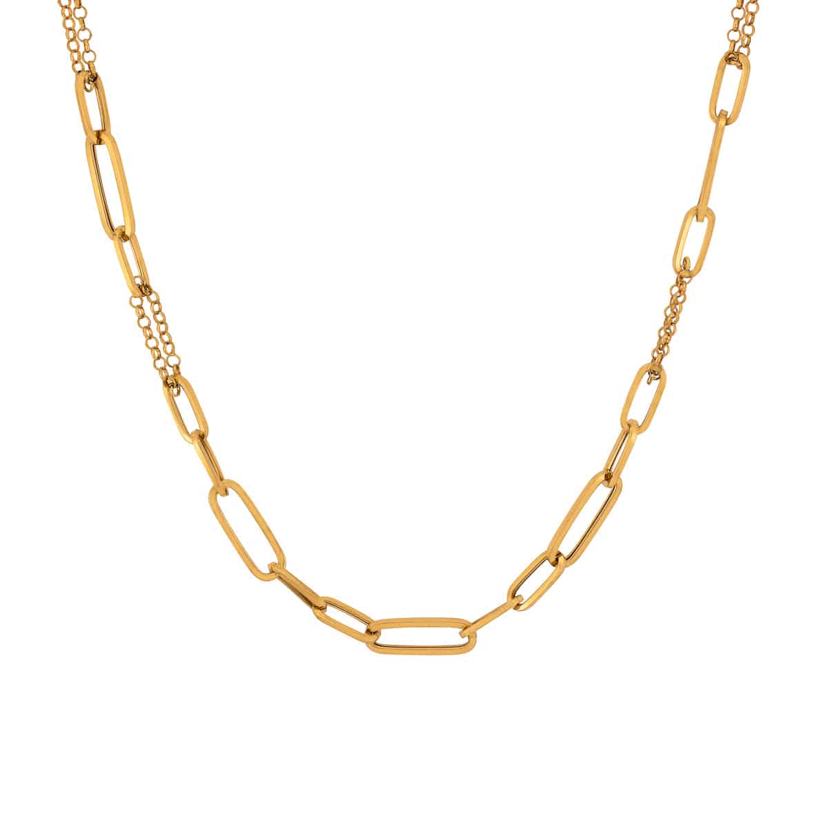 Naszyjnik wykonano z najwyższej jakości żółtego złota, które olśniewa swoim ciepłym, słonecznym blaskiem. Każde ogniwo jest starannie wyprofilowane, tworząc harmonijną całość z delikatnymi elementami łańcuszka rolo. Proporcje są doskonale wyważone, co podkreśla subtelny, ale zarazem wyrazisty charakter tej biżuterii. Brak zdobień i kamieni sprawia, że naszyjnik jest uniwersalnym dodatkiem, idealnym na każdą okazję.