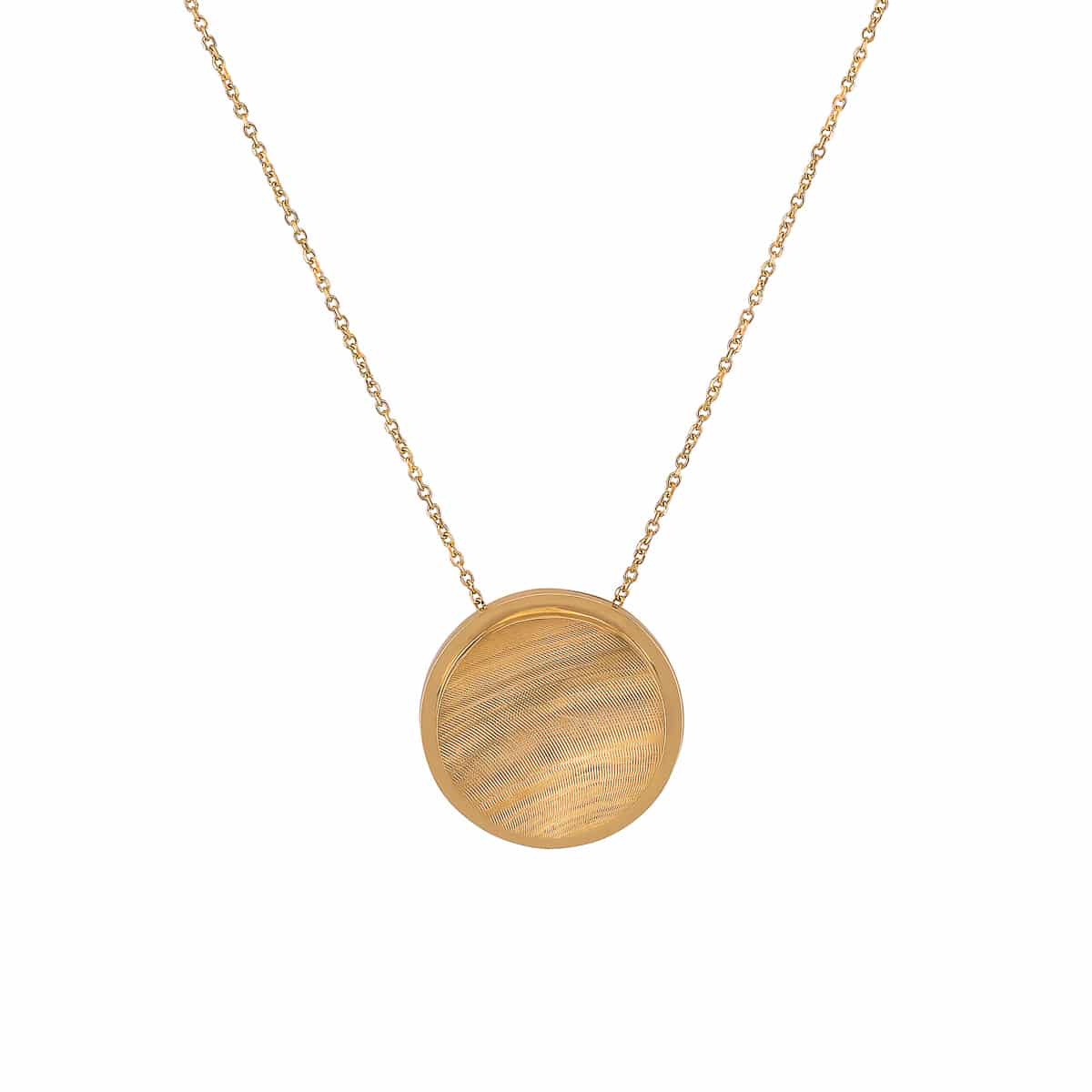Wykonany z najwyższej jakości żółtego złota, naszyjnik zachwyca ciepłym, przyjaznym odcieniem, który doskonale komponuje się z różnorodnymi stylizacjami. Pełne koło o satynowym wykończeniu stanowi centralny punkt kompozycji, dodając jej wyrafinowanego charakteru. Subtelna faktura powierzchni przyciąga wzrok i nadaje całości niepowtarzalnego uroku.