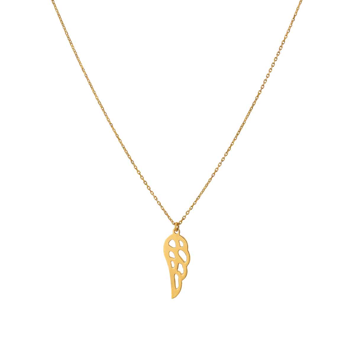 Naszyjnik wykonany jest z wysokiej jakości żółtego złota, które lśni ciepłym, promiennym blaskiem. Jego centralnym elementem jest urocze skrzydełko, symbolizujące wolność i lekkość. Precyzyjnie wycięte wzory na powierzchni skrzydełka dodają mu charakteru i głębi, tworząc efekt delikatnej koronki. Całość osadzona jest na eleganckim, subtelnym łańcuszku, który idealnie podkreśla dekolt, nie przytłaczając go.