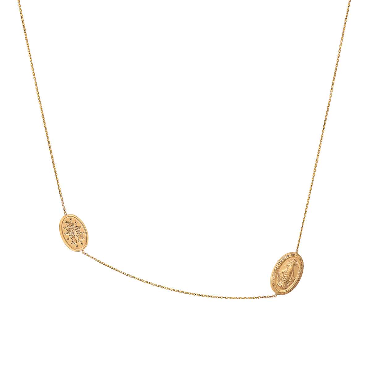 Naszyjnik wykonany jest z żółtego złota, które emanuje ciepłym blaskiem, dodając każdej stylizacji niepowtarzalnego uroku. Dwa owalne medaliony, umieszczone symetrycznie na subtelnej, delikatnej łańcuszku, przyciągają uwagę swoją precyzyjnie wykonaną fakturą. Każdy medalion zdobi unikalny wzór, który nadaje całości głębi i znaczenia.