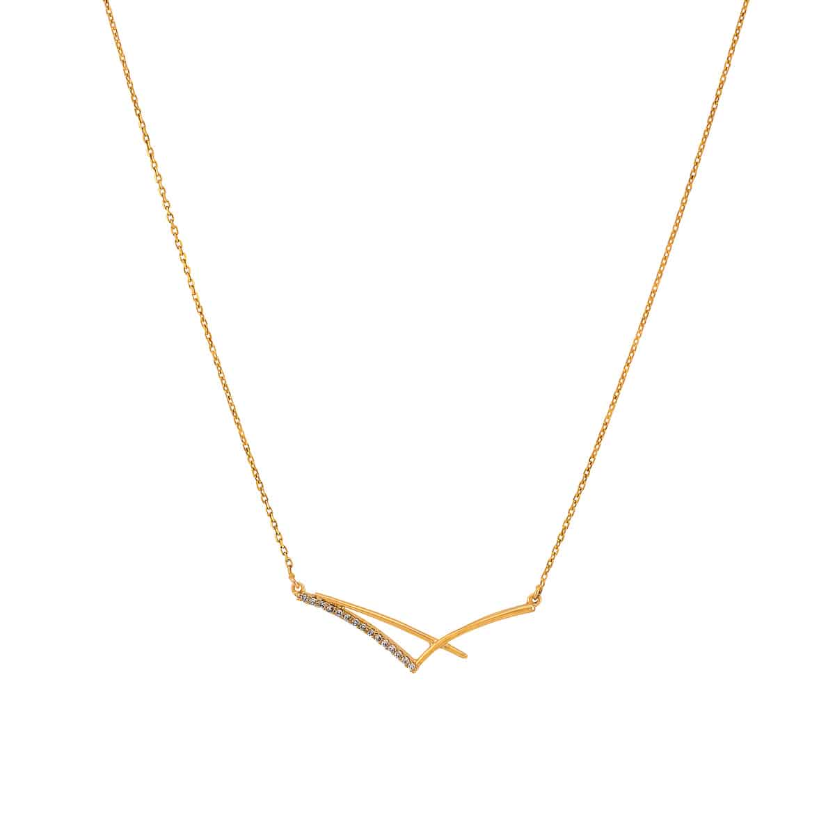 Naszyjnik wykonany jest z najwyższej jakości żółtego złota, które emanuje ciepłym, bogatym odcieniem. Jego nowoczesna, asymetryczna forma wyróżnia się na tle klasycznej biżuterii, przyciągając uwagę subtelnym, lecz wyrazistym designem. Delikatne brylanty, starannie osadzone w jednym z ramion naszyjnika, dodają mu blasku, podkreślając wyrafinowanie i szyk.