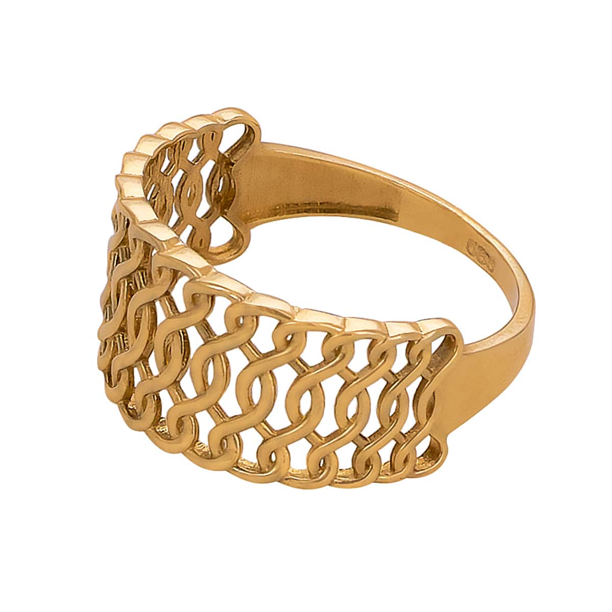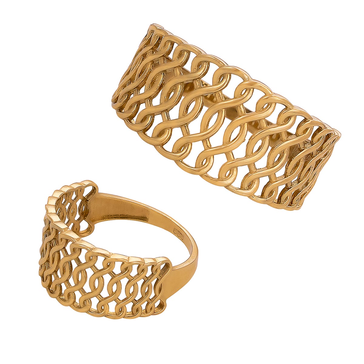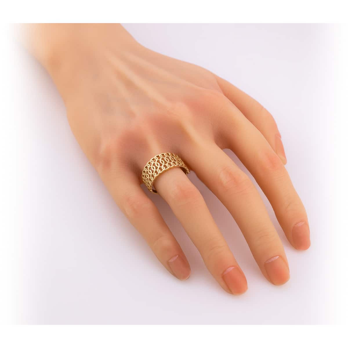 Pierścionek wykonany jest z żółtego złota o ciepłym, szlachetnym odcieniu, który wspaniale komponuje się z różnorodnymi kreacjami. Ażurowa forma przypomina misternie splecione nici, tworząc efekt lekkości i delikatności. Proporcje pierścionka są doskonale zbalansowane, co sprawia, że jest on nie tylko piękny, ale i wygodny w noszeniu.