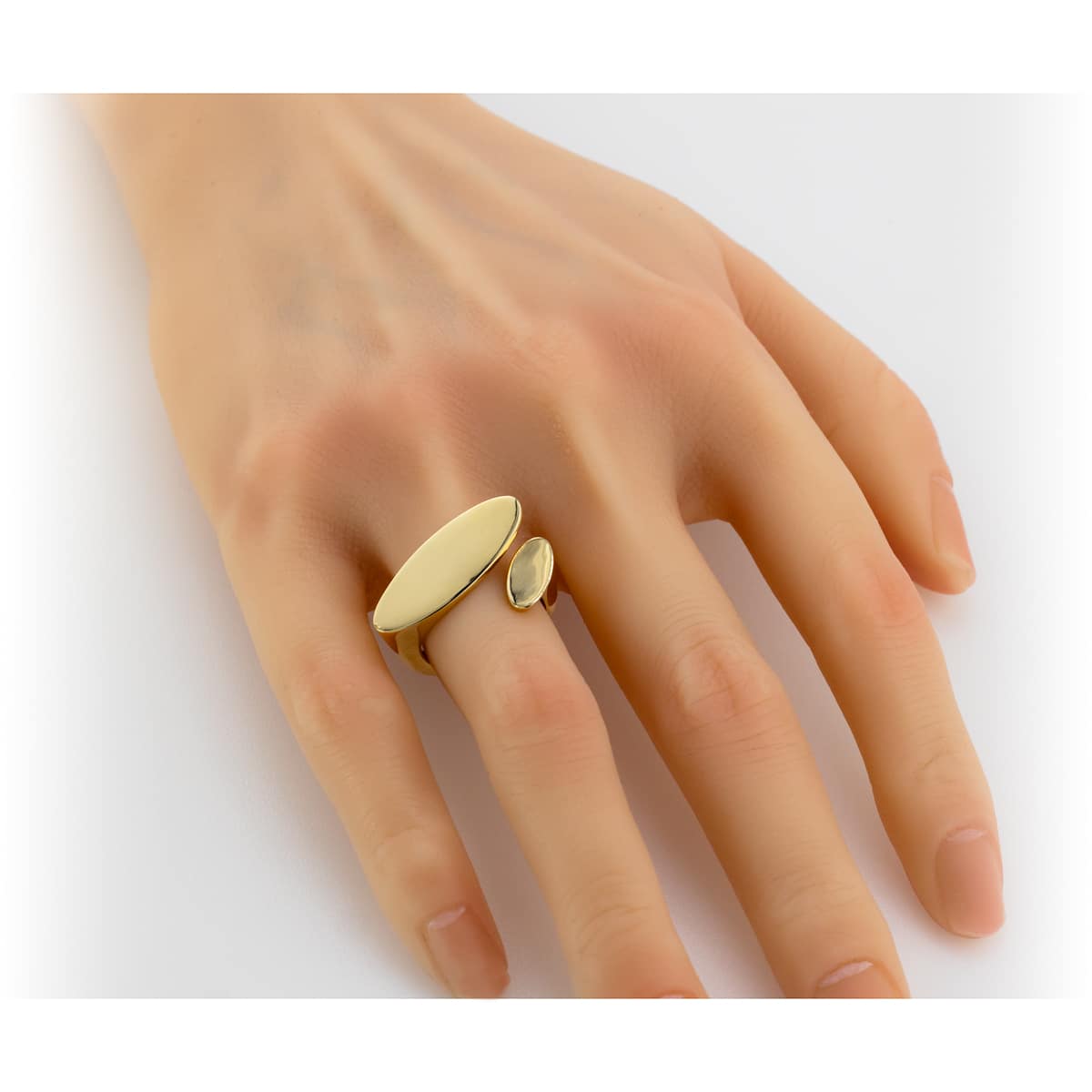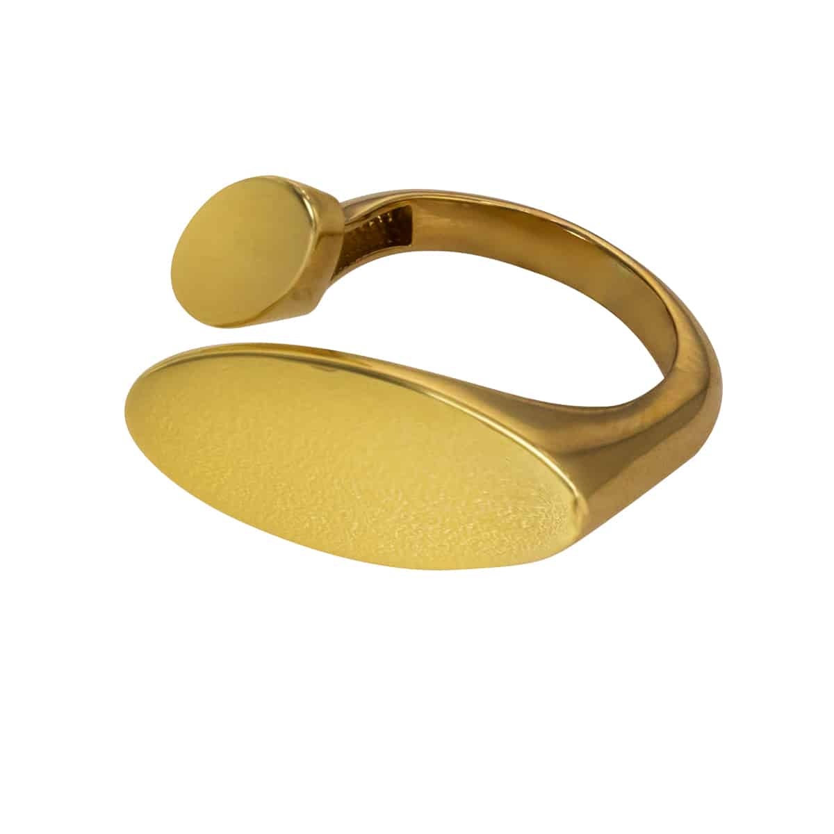 Wykonany z najwyższej jakości żółtego złota, pierścionek prezentuje się niezwykle szykownie. Jego otwarta forma jest zarówno nowoczesna, jak i praktyczna, umożliwiając łatwe dopasowanie do palca. Gładka, polerowana powierzchnia błyszczy przy każdym ruchu dłoni, a subtelne owalne zdobienie dodaje mu wyjątkowego charakteru.