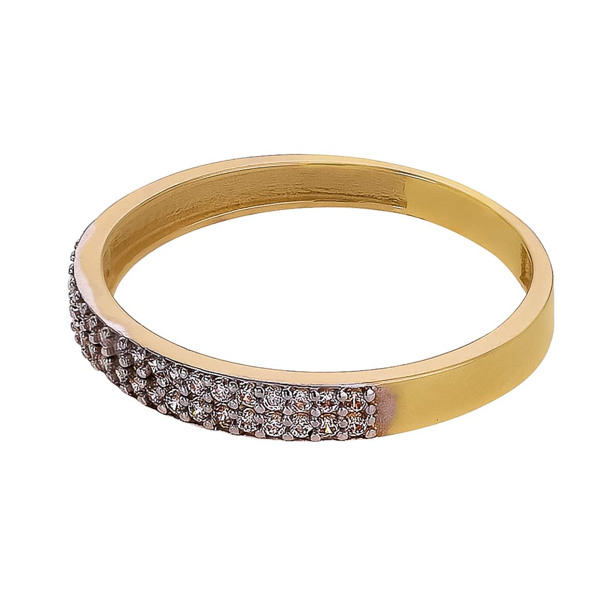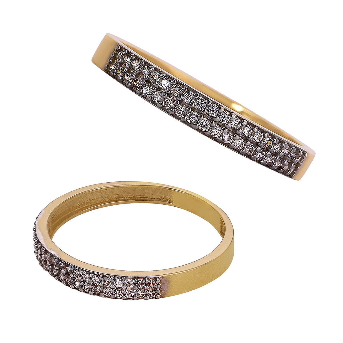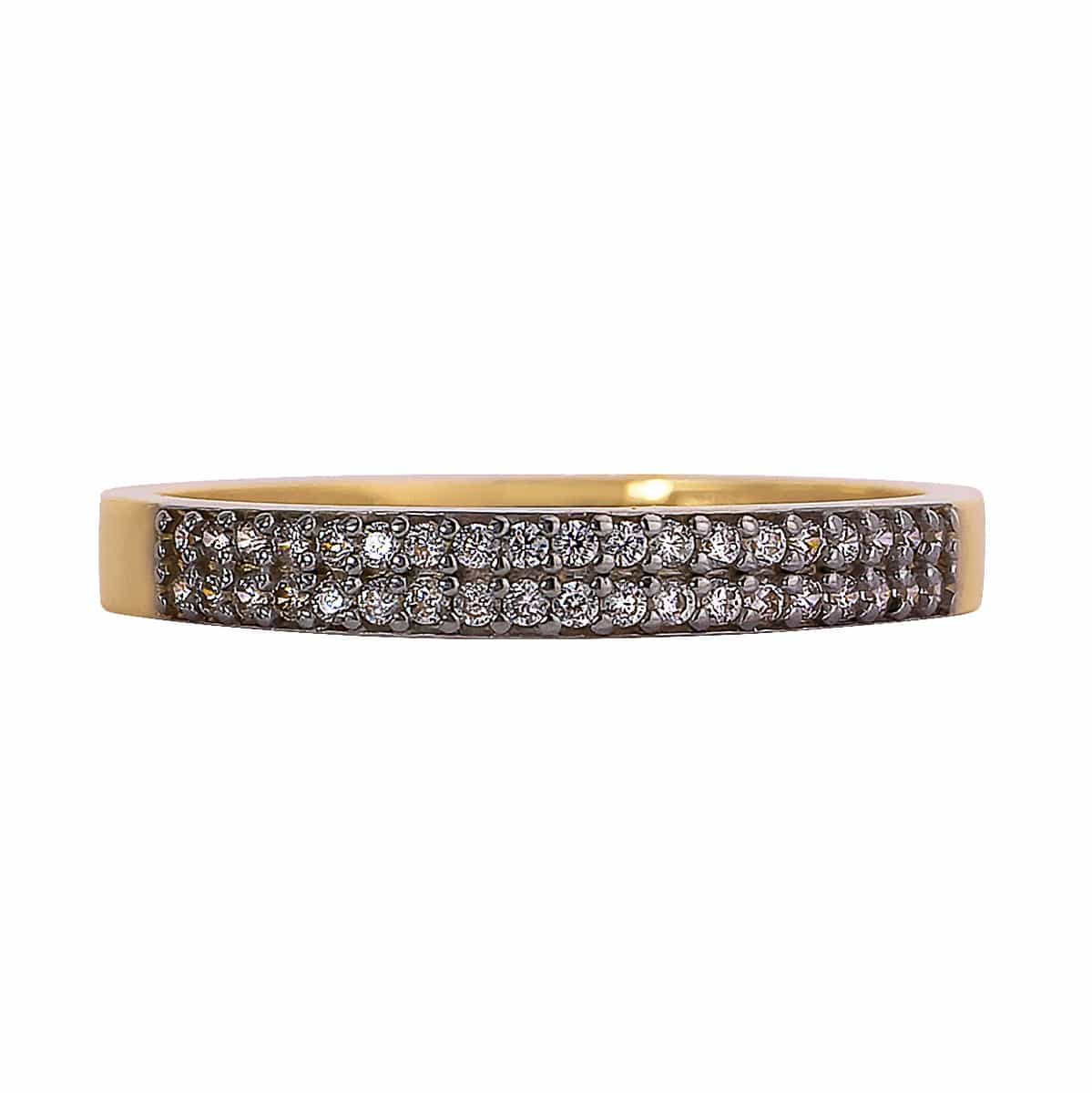 Pierścionek wykonany jest z żółtego złota, które emanuje ciepłym, szlachetnym blaskiem. Jego prosty, obrączkowy kształt jest subtelnie ozdobiony rzędem lśniących cyrkonii, które zostały precyzyjnie osadzone, tworząc harmonijną całość. Cyrkonie, o jasnym, krystalicznym blasku, są umieszczone w dwóch rzędach, co dodaje pierścionkowi głębi i wyrafinowania.