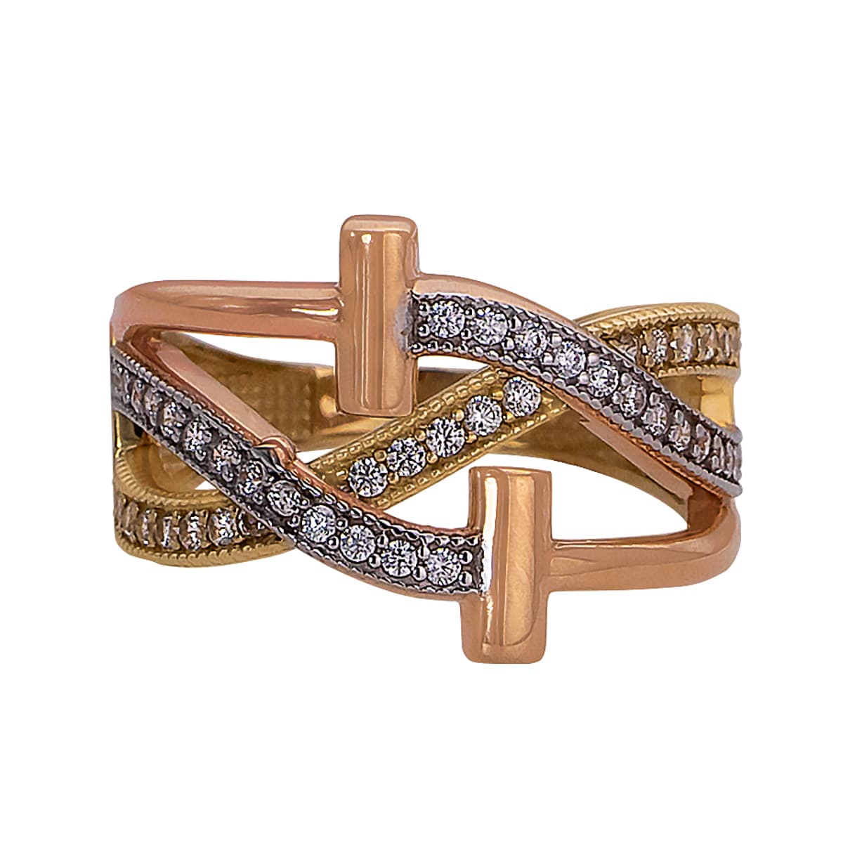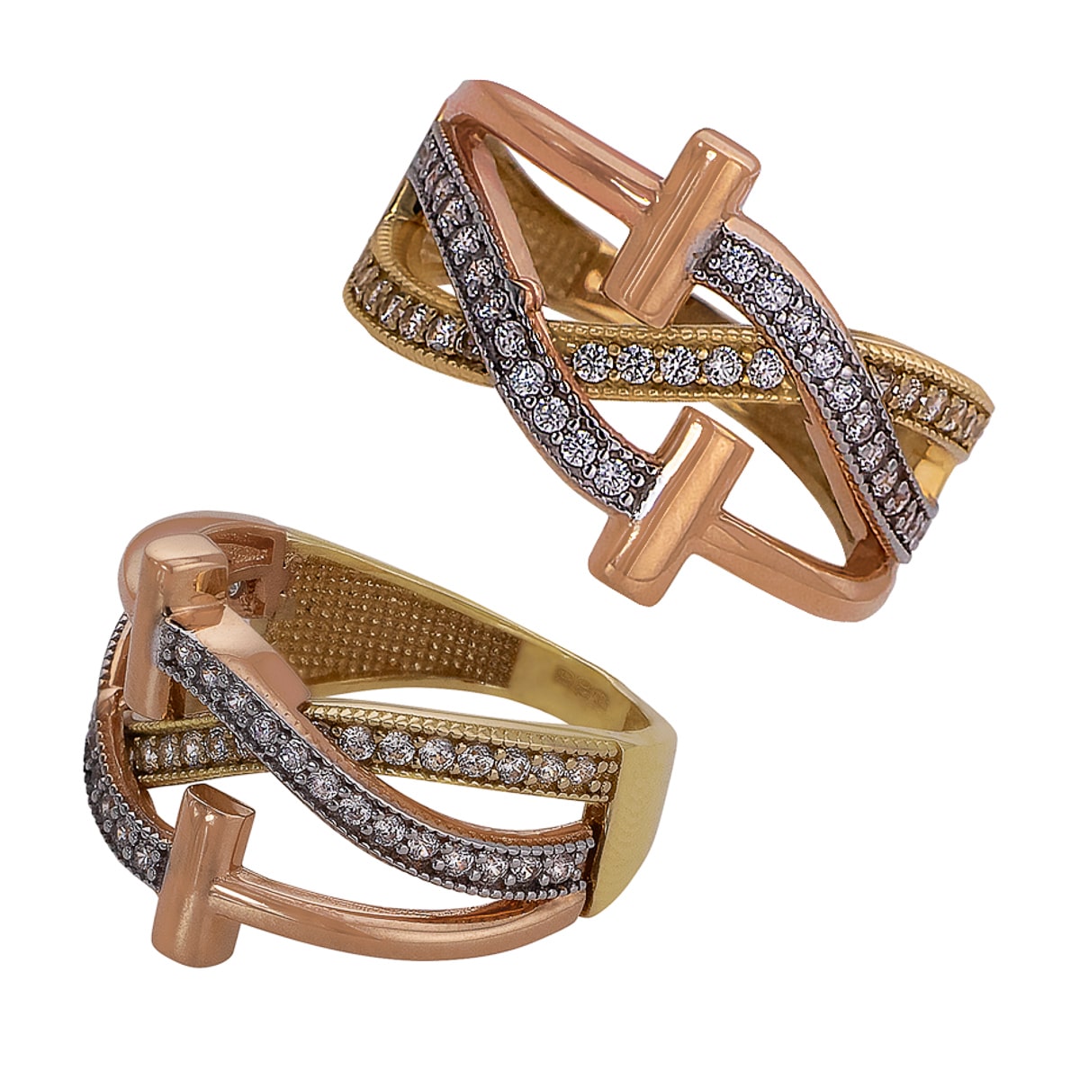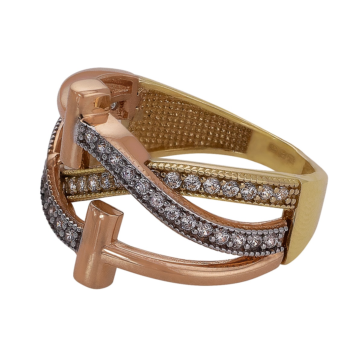 Pierścionek obrączkowy z żółtego, różowego i białego złota z cyrkoniami pr. 585