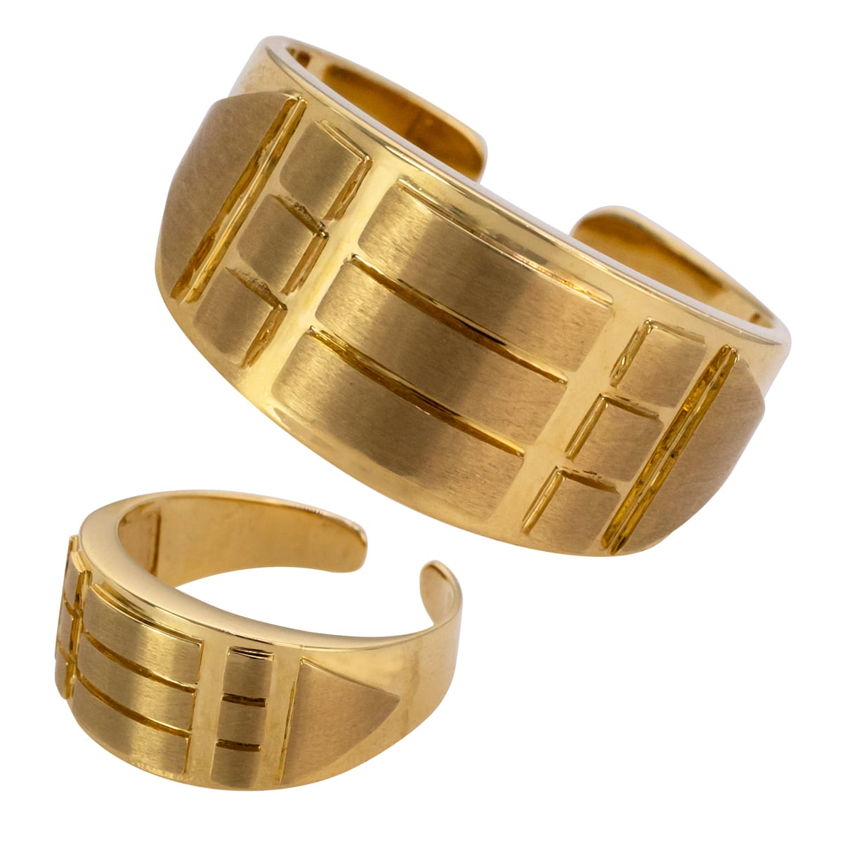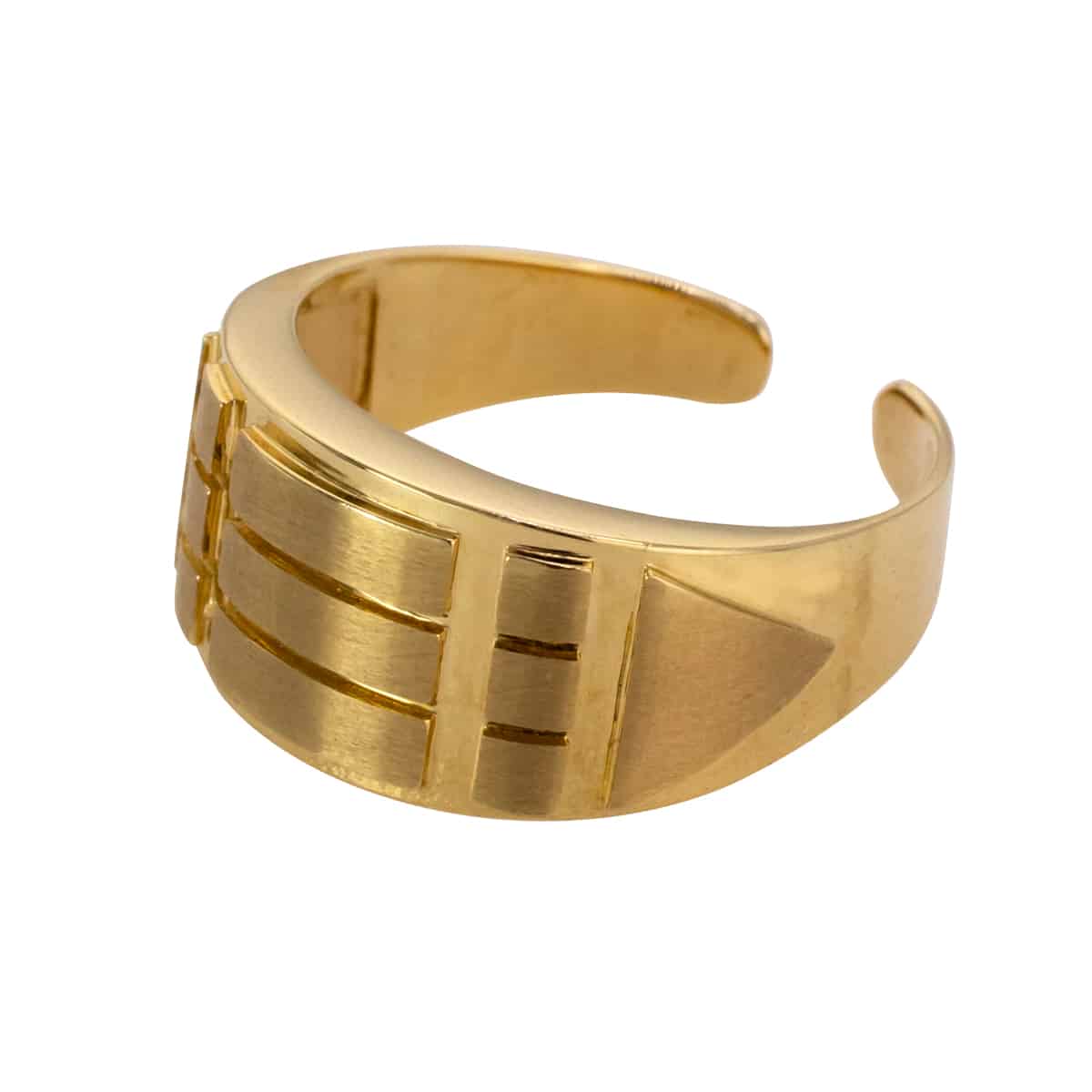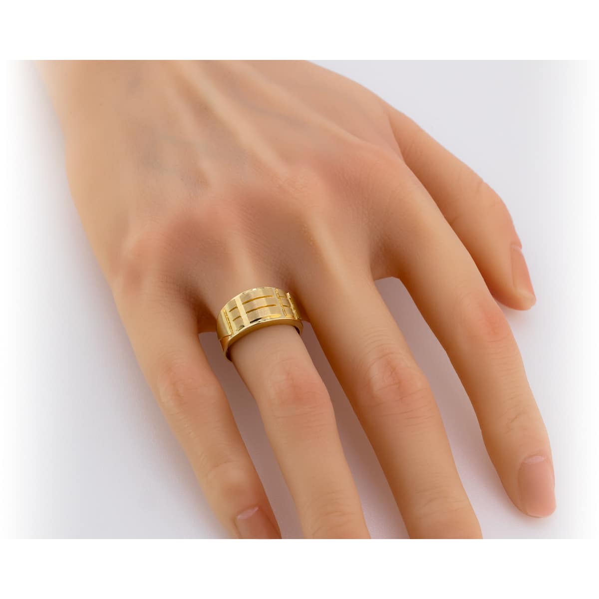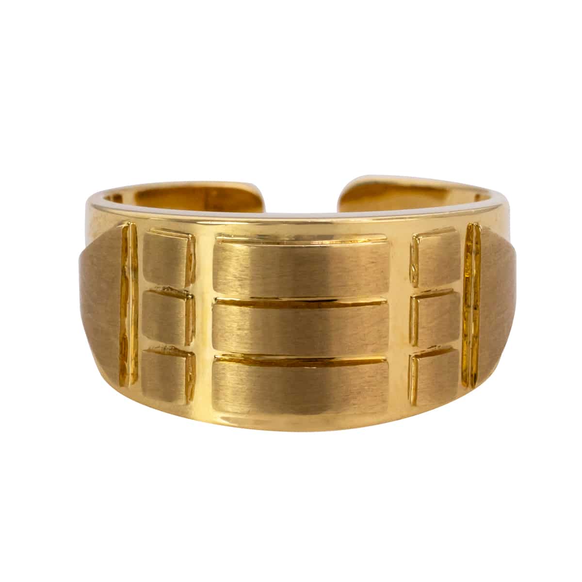 Pierścionek wykonany jest z żółtego złota o subtelnym, matowym wykończeniu, które nadaje mu wyjątkowego charakteru. Jego szeroka obrączka przyciąga uwagę geometrycznymi zdobieniami, które tworzą ciekawą grę światła i cienia. Proporcje są doskonale zbalansowane, a brak dodatkowych kamieni podkreśla jego minimalistyczny urok. Ta biżuteria jest przykładem doskonałego połączenia nowoczesności z klasyką.