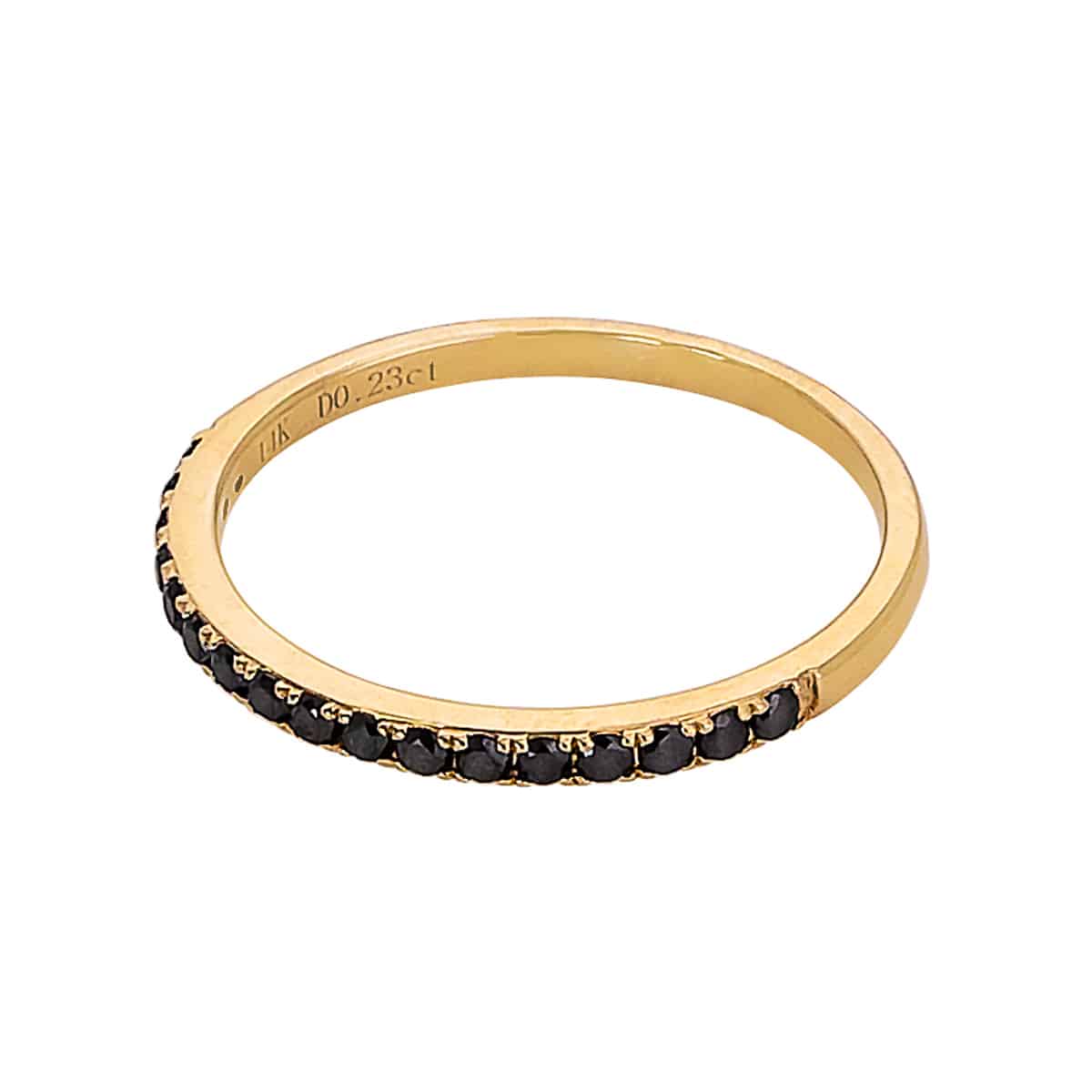 Przenieś się do świata luksusu i elegancji z wyjątkowym pierścionkiem obrączkowym z żółtego złota, zdobionym czarnymi brylantami o łącznej masie 0,23ct. Ta biżuteria to prawdziwa perła w koronie każdej kolekcji, która przyciąga spojrzenia i dodaje blasku każdej chwili.