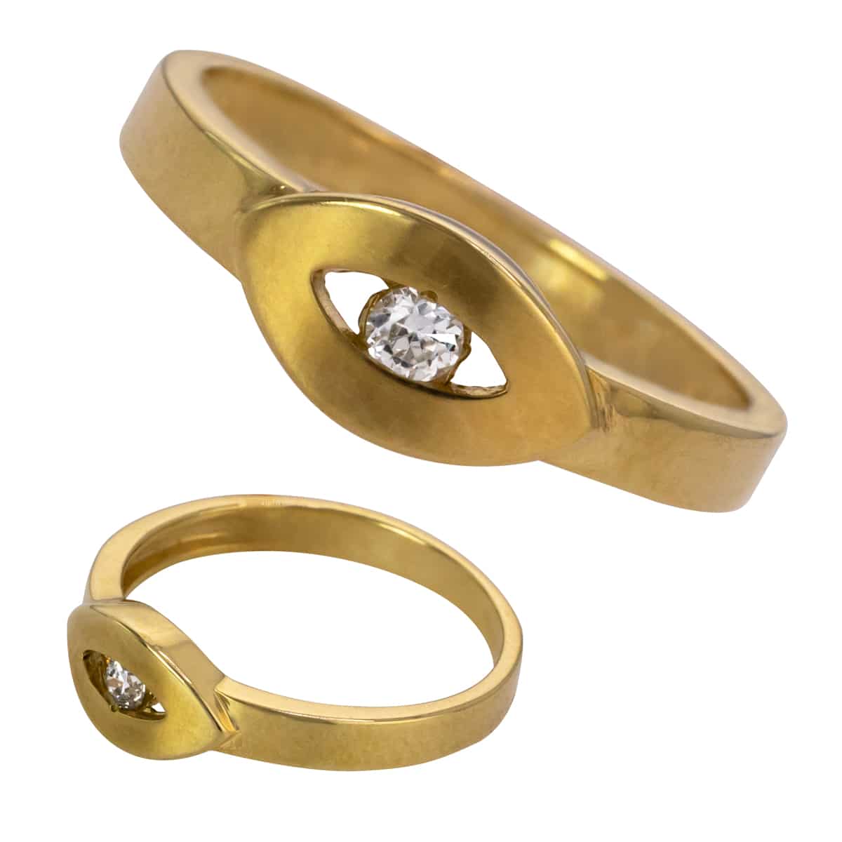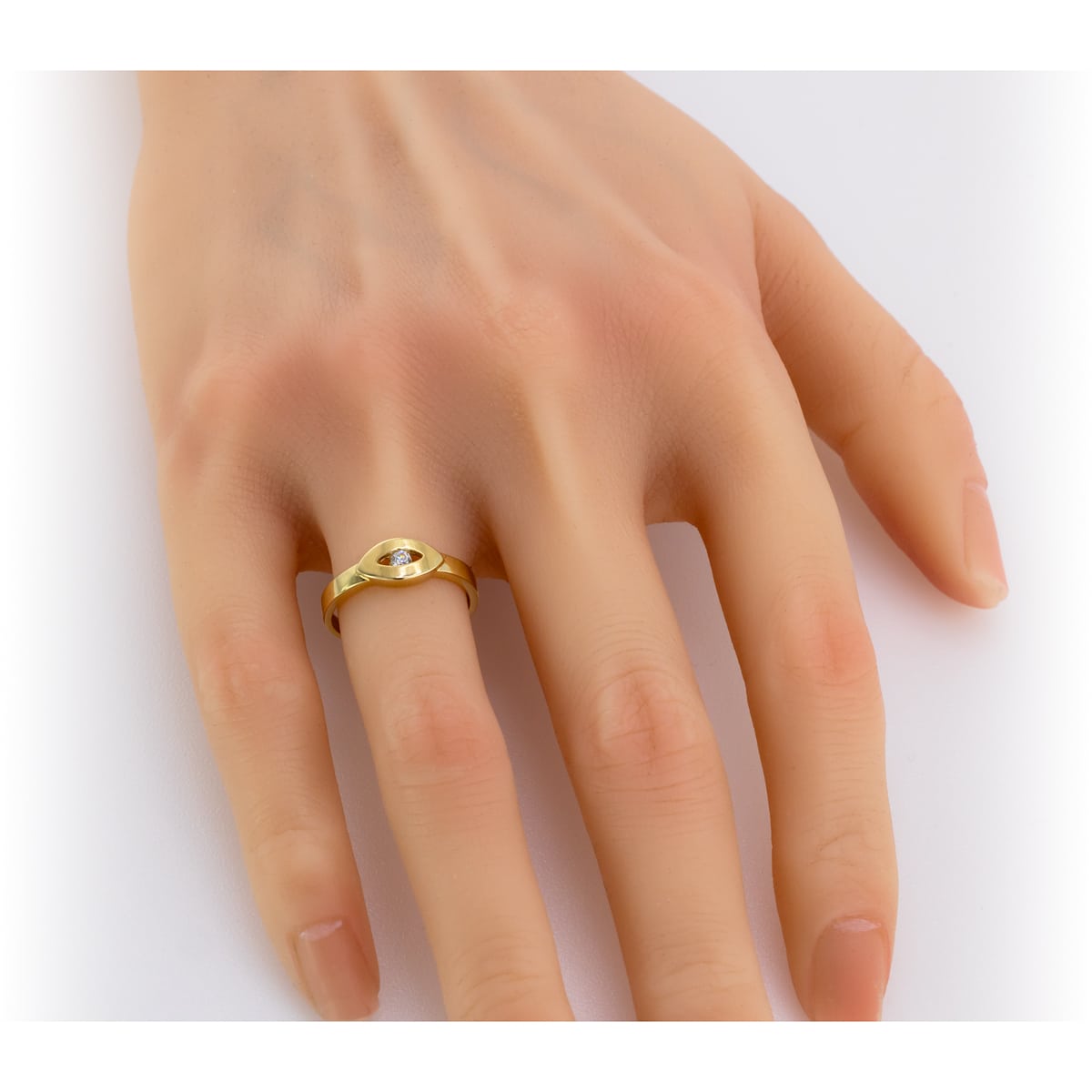 Pierścionek wykonany jest z żółtego złota o ciepłym, przyjemnym dla oka odcieniu. Jego nowoczesny design wyróżnia się dzięki unikalnemu kształtowi, który sprawia, że to nie tylko biżuteria, ale prawdziwe dzieło sztuki. Centralnie umieszczona cyrkonia dodaje blasku i elegancji, przyciągając wzrok subtelnym połyskiem. Gładkie wykończenie pierścionka zapewnia komfort noszenia na co dzień, a jednocześnie podkreśla jego wyrafinowany charakter.