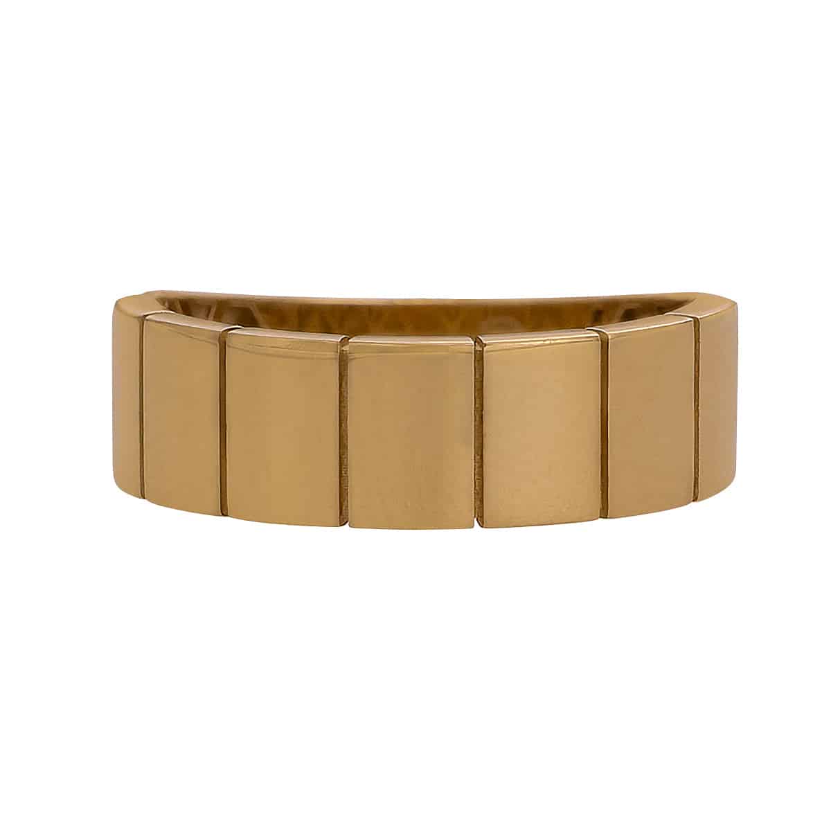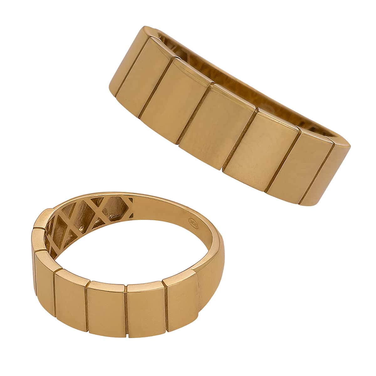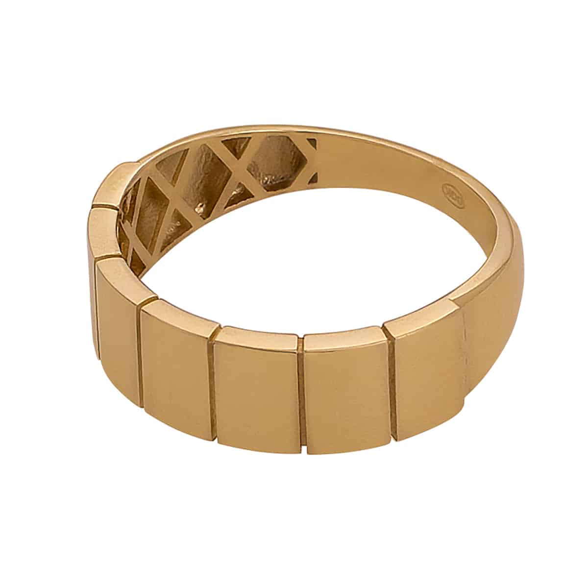 Pierścionek wykonany jest z najwyższej jakości żółtego złota o ciepłym, głębokim odcieniu, który doskonale komponuje się z każdym typem urody. Jego forma jest inspirowana nowoczesnymi trendami, co czyni go idealnym dodatkiem do każdej stylizacji. Geometryczny wzór pierścionka zapewnia mu oryginalność, a jednocześnie subtelność, dzięki której może być noszony zarówno na co dzień, jak i na specjalne okazje.