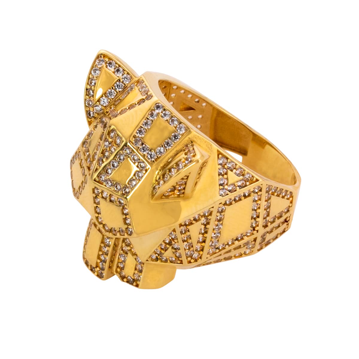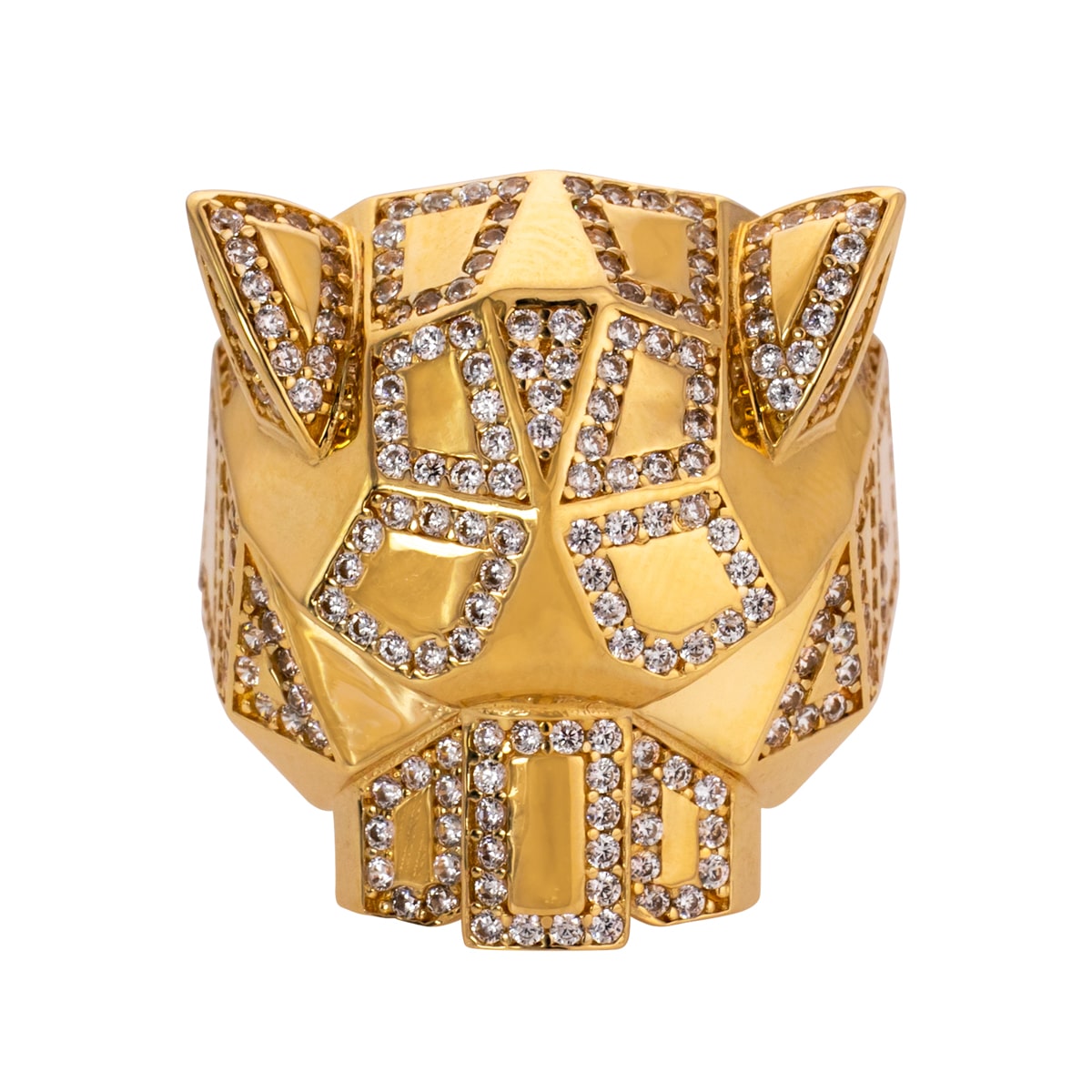 Pierścionek wykonany jest z najwyższej jakości żółtego złota, które emanuje ciepłym, luksusowym blaskiem. Kształt głowy pantery jest wyrazisty i pełen charakteru, a cyrkonie misternie osadzone na powierzchni dodają mu niepowtarzalnego blasku. Kamienie te, o perfekcyjnym szlifie, lśnią niczym prawdziwe diamenty, podkreślając elegancję i finezję tego wyjątkowego pierścionka.