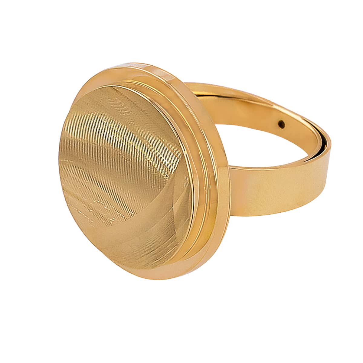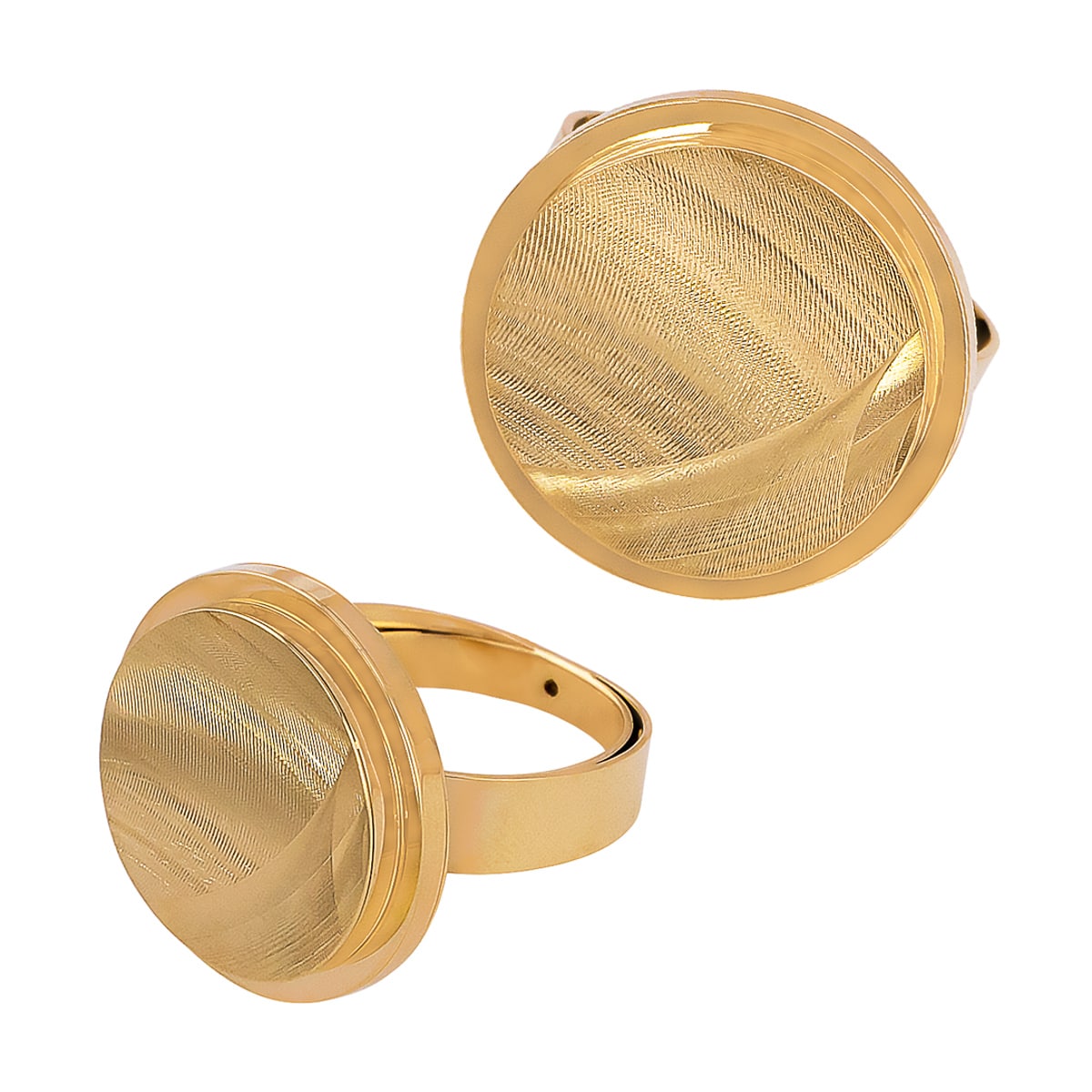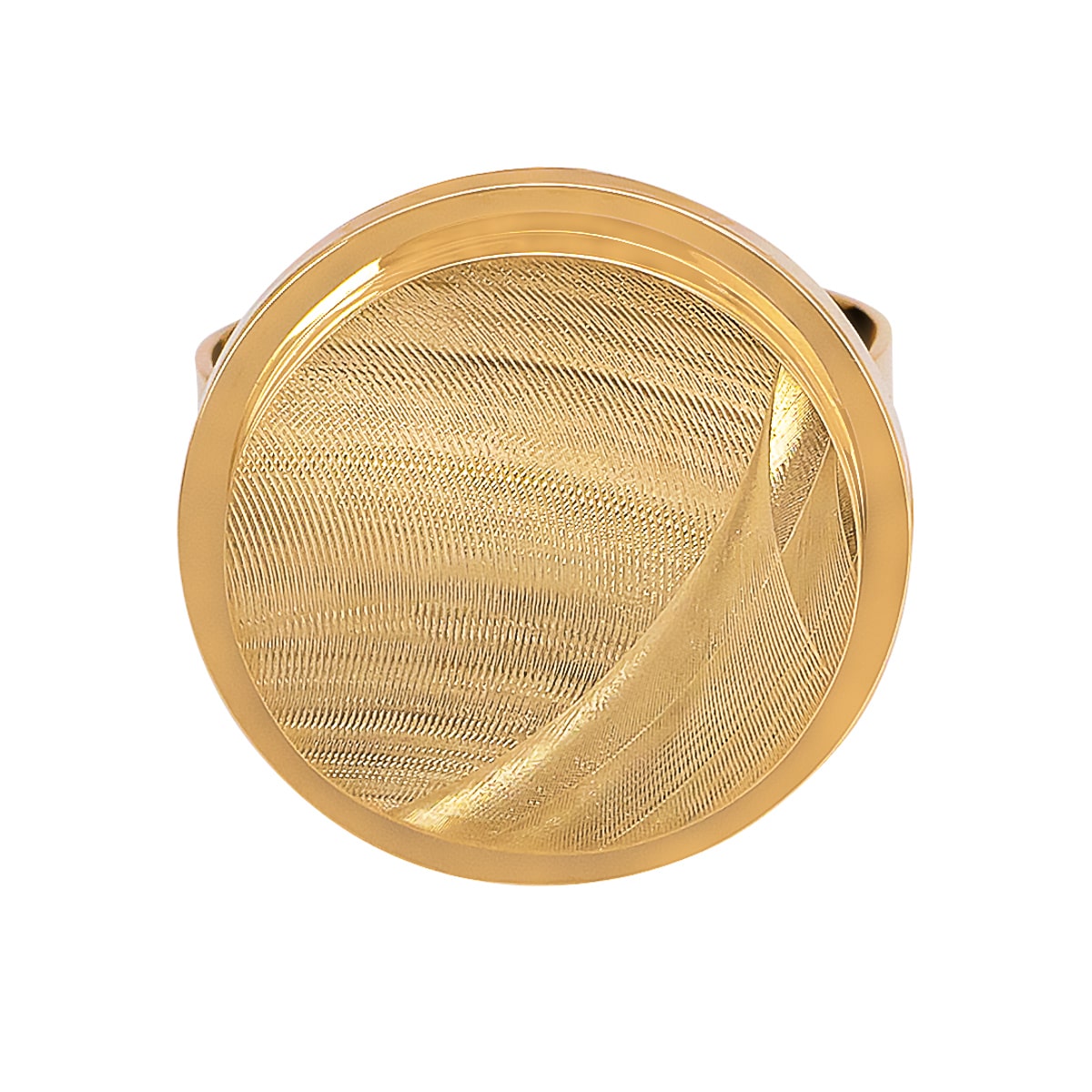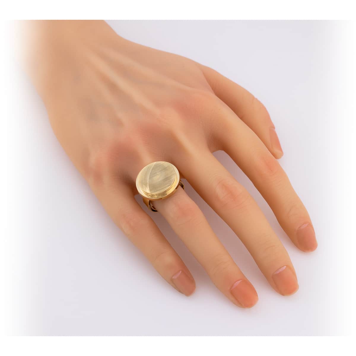 Pierścionek wykonany jest z najwyższej jakości żółtego złota, które emanuje ciepłym, promiennym blaskiem. Jego charakterystycznym elementem jest pełne satynowe koło, które stanowi centralny punkt projektu. Satynowe wykończenie powierzchni dodaje głębi i tekstury, tworząc efekt subtelnej gry światła, który przyciąga wzrok i podkreśla oryginalność tego dzieła jubilerskiego.