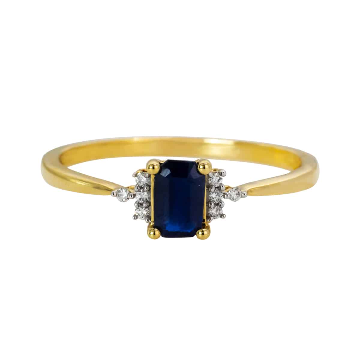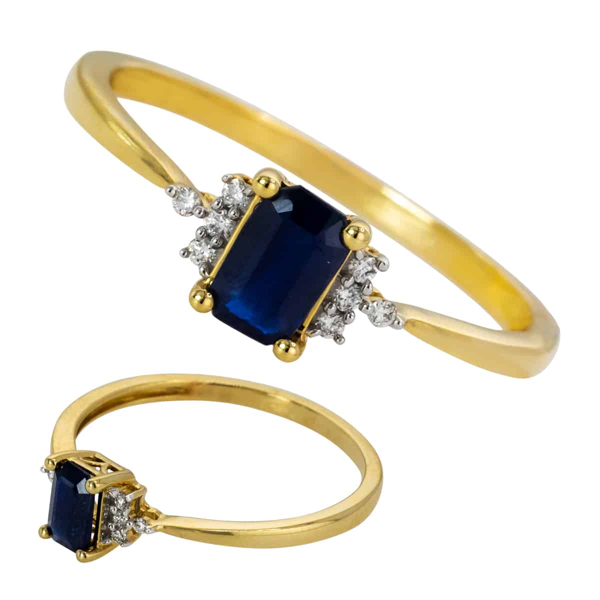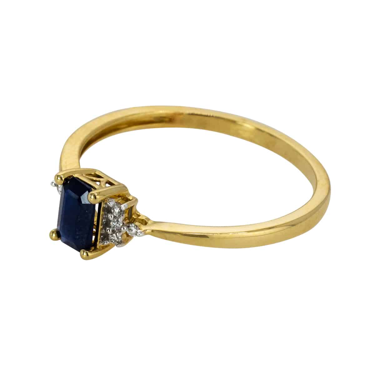 Pierścionek wykonany jest z żółtego złota o ciepłej, przyjemnej dla oka barwie, która doskonale komponuje się z głębokim niebieskim odcieniem szafiru. Centralny kamień, o szlifie prostokątnym, zachwyca swą intensywnością i głębią, przyciągając wzrok i dodając blasku każdej stylizacji. Otaczają go drobne brylanty, które w subtelny sposób podkreślają jego piękno i dodają pierścionkowi niepowtarzalnego uroku.