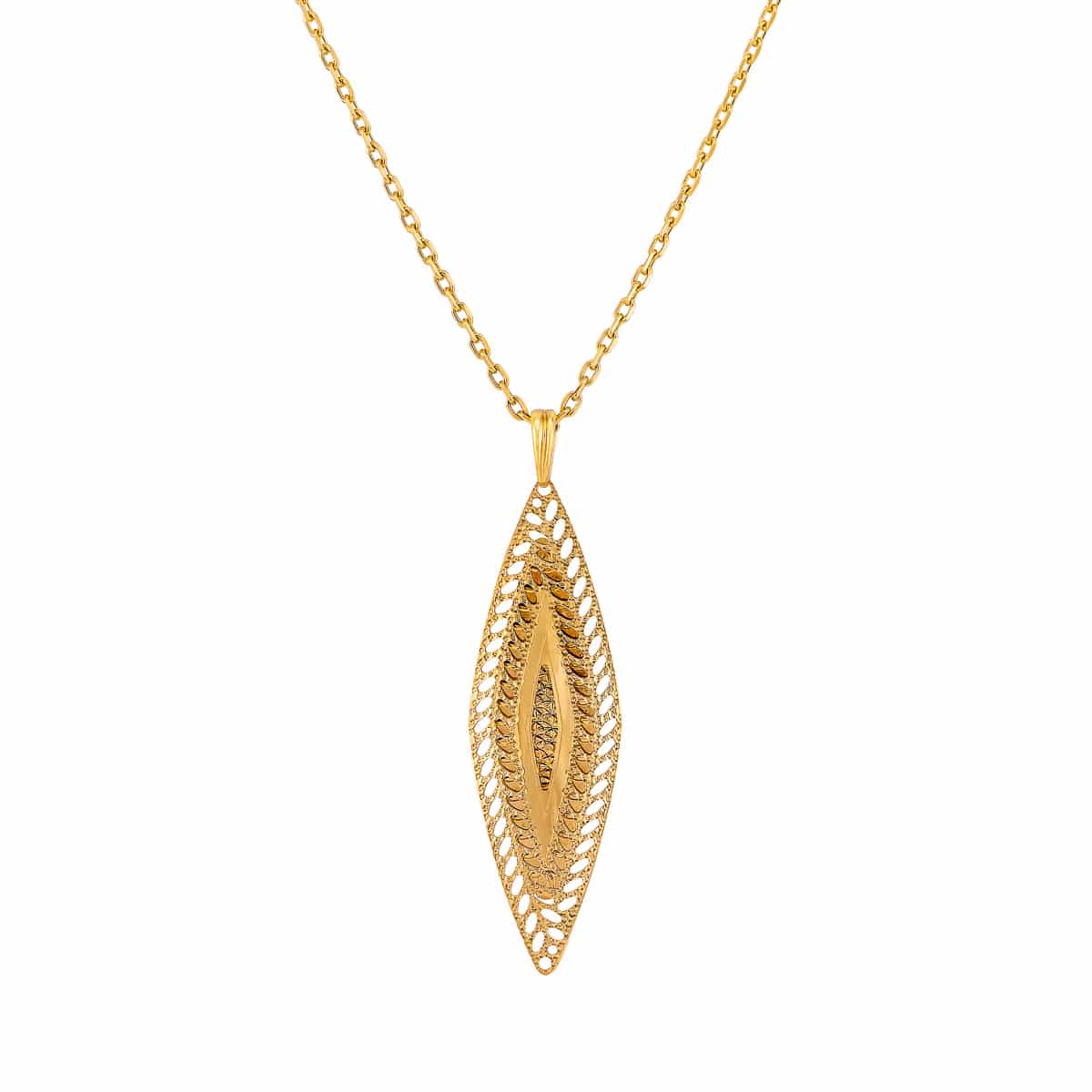 Wykonana z najwyższej jakości żółtego złota, zawieszka zachwyca delikatnym, liściastym kształtem, który emanuje naturalnym wdziękiem. Ażurowy wzór tworzy efekt lekkości i przestrzenności, co sprawia, że biżuteria subtelnie mieni się przy każdym ruchu. Niezwykle precyzyjne wykończenie podkreśla elegancję i wyrafinowanie, czyniąc ją idealnym dodatkiem zarówno do codziennych, jak i wieczorowych kreacji.