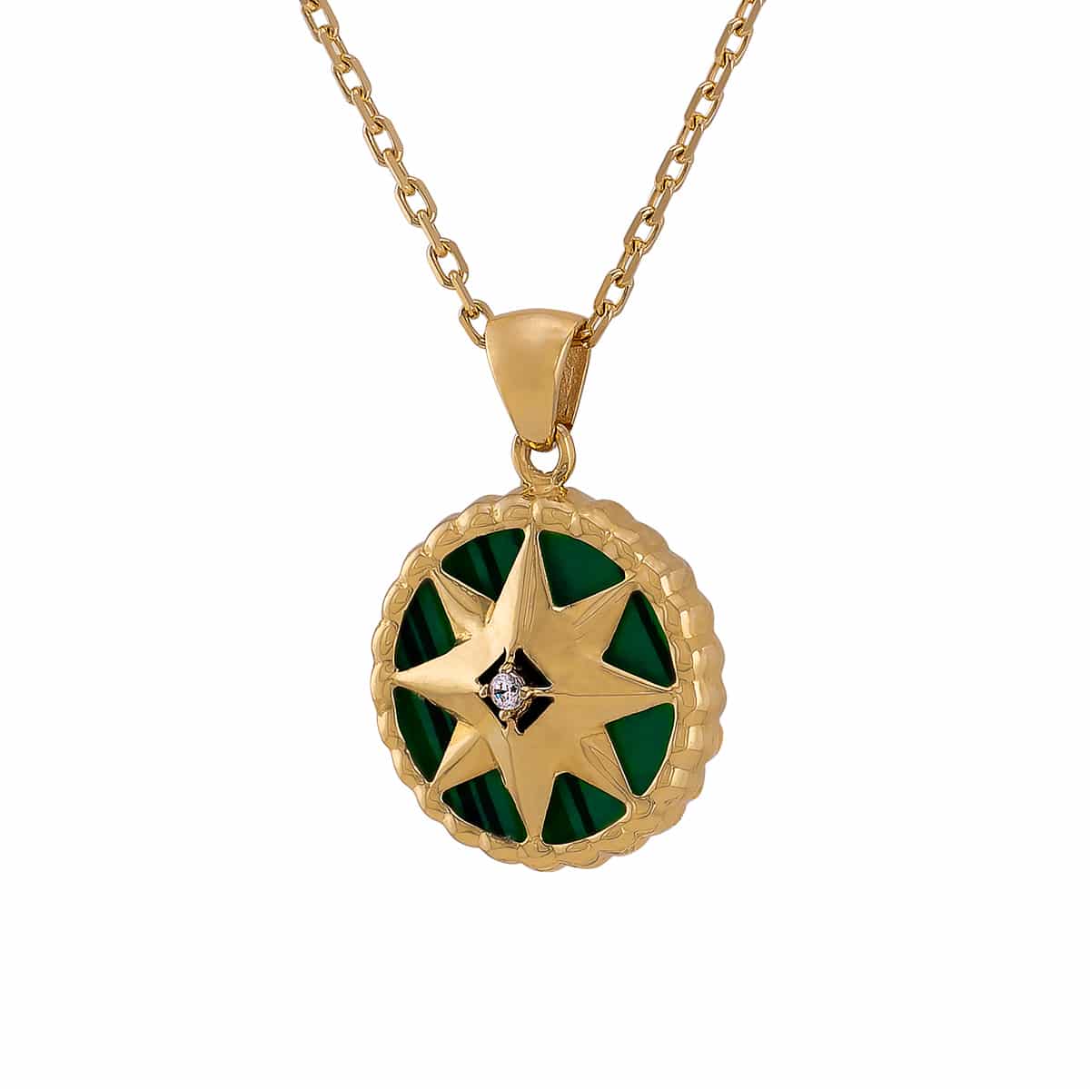 Centralnym elementem tej zawieszki jest kształt gwiazdy, który harmonijnie komponuje się z zielonym malachitem, dodając całości głębi i tajemniczości. Malachit, o intensywnym, zielonym kolorze, jest znany z bogactwa odcieni, które doskonale kontrastują z metalicznym połyskiem złota. Subtelnie osadzona cyrkonia, umieszczona w samym sercu gwiazdy, dodaje zawieszce niepowtarzalnego blasku, odbijając światło z niezwykłą intensywnością.