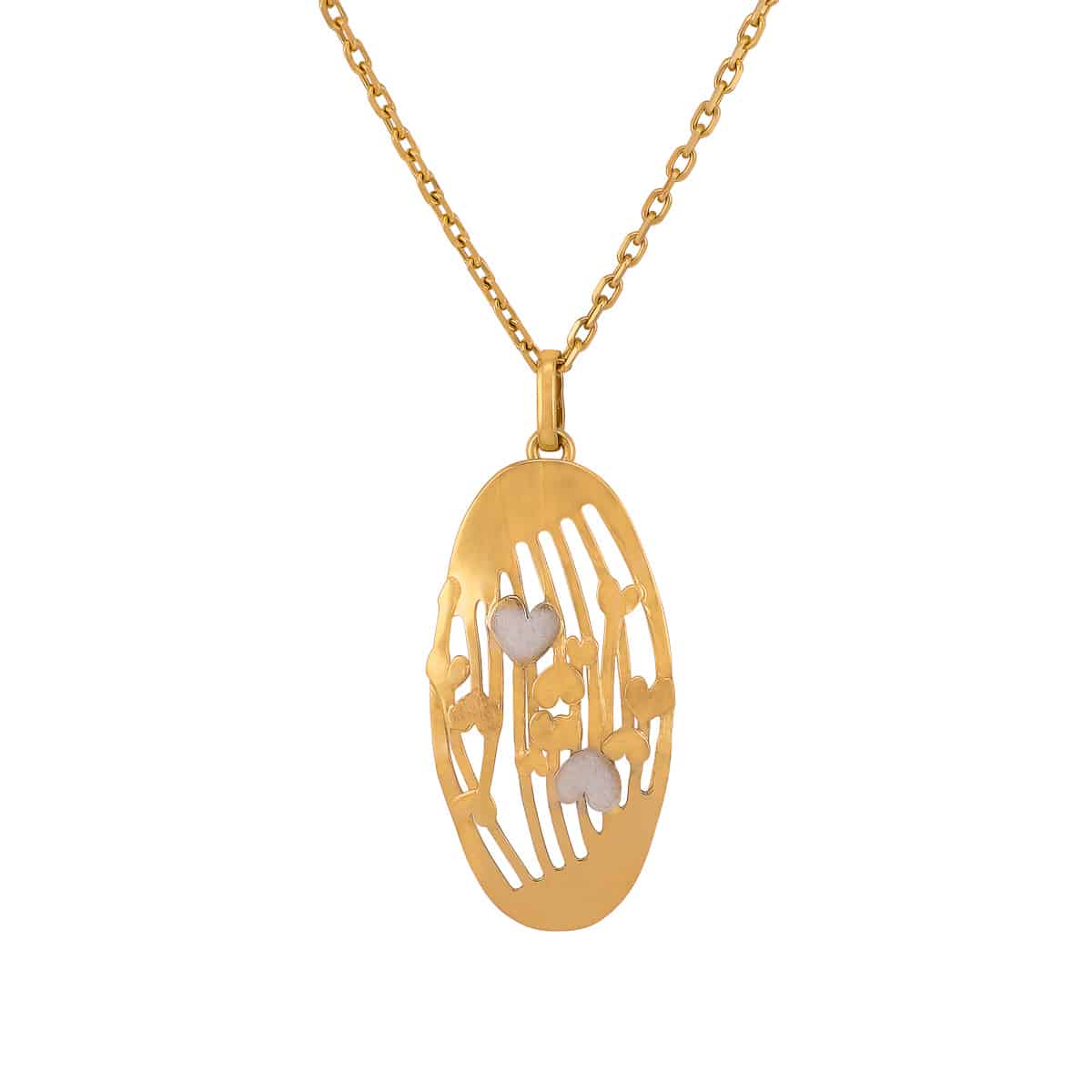 Zawieszka wykonana jest z pięknego połączenia żółtego i białego złota, tworząc harmonijną i elegancką kompozycję kolorystyczną. Owalny kształt jest idealnie proporcjonalny, a jego powierzchnia zdobią delikatne wzory w kształcie serduszek, które nadają zawieszce romantycznego charakteru. Dodatkowo, matowe wykończenie podkreśla subtelność i unikalność tej biżuterii, przyciągając uwagę swoim nietuzinkowym wyglądem.