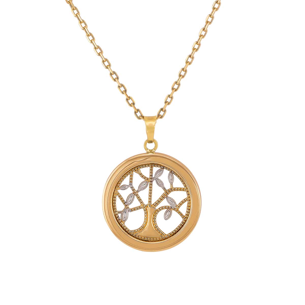 Zawieszka wykonana jest z dwóch rodzajów złota – żółtego i białego – które harmonijnie się uzupełniają, tworząc niezwykle elegancką całość. Centralnym punktem jest drzewko szczęścia, symbol życia i pozytywnej energii, umieszczone w delikatnym, okrągłym obramowaniu. Żółte złoto nadaje ciepły odcień, podczas gdy akcenty z białego złota dodają nowoczesnego blasku.