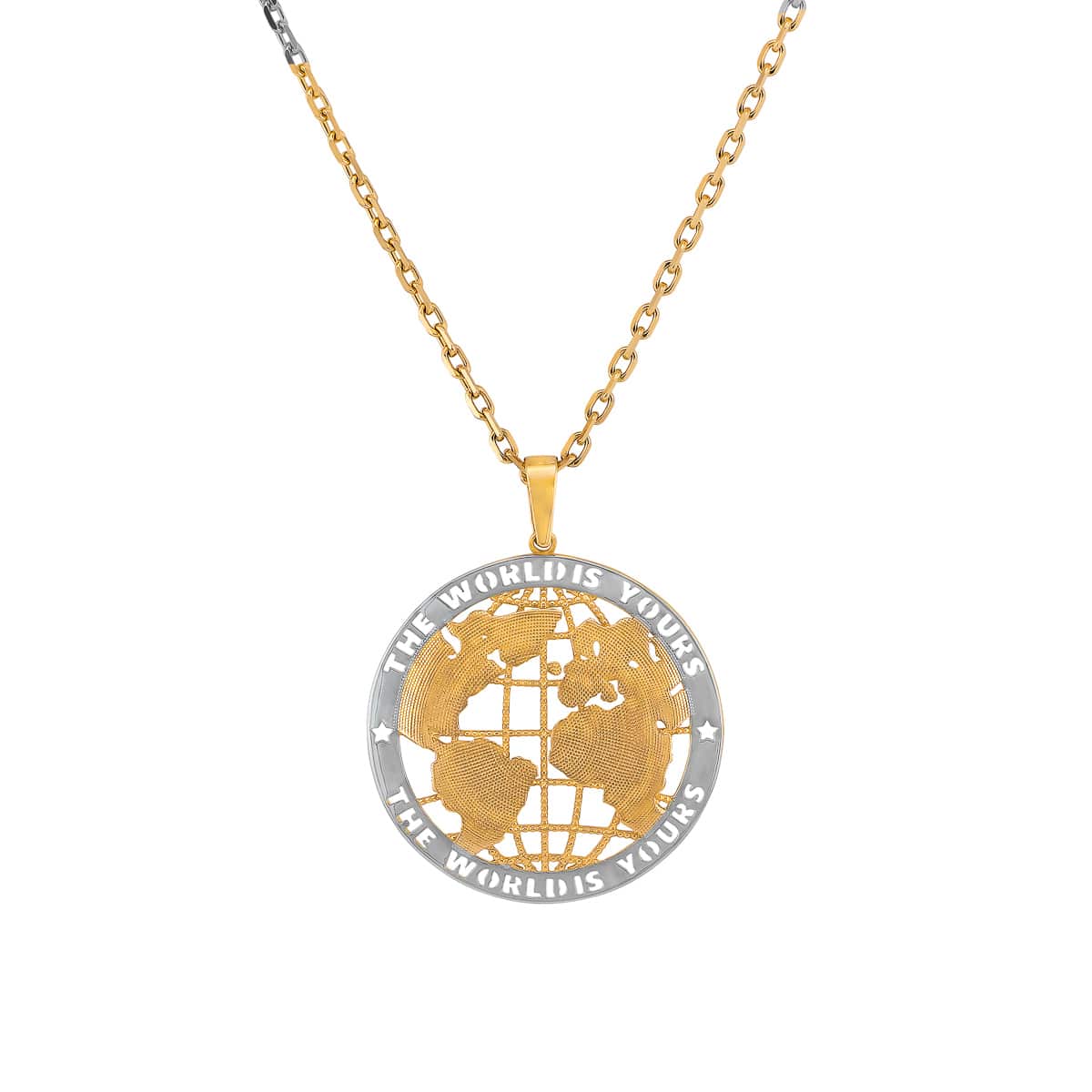 Na zdjęciu widzimy misternie wykonaną zawieszkę, której centralnym elementem jest ażurowa mapa świata z żółtego złota. Okrągły kształt podkreśla delikatność detali, a kontrastujące białe złoto otacza mapę, tworząc elegancką ramę z napisem „THE WORLD IS YOURS”. Wyjątkowe wykończenie i harmonijne proporcje sprawiają, że zawieszka przyciąga wzrok i dodaje klasy każdej stylizacji.
