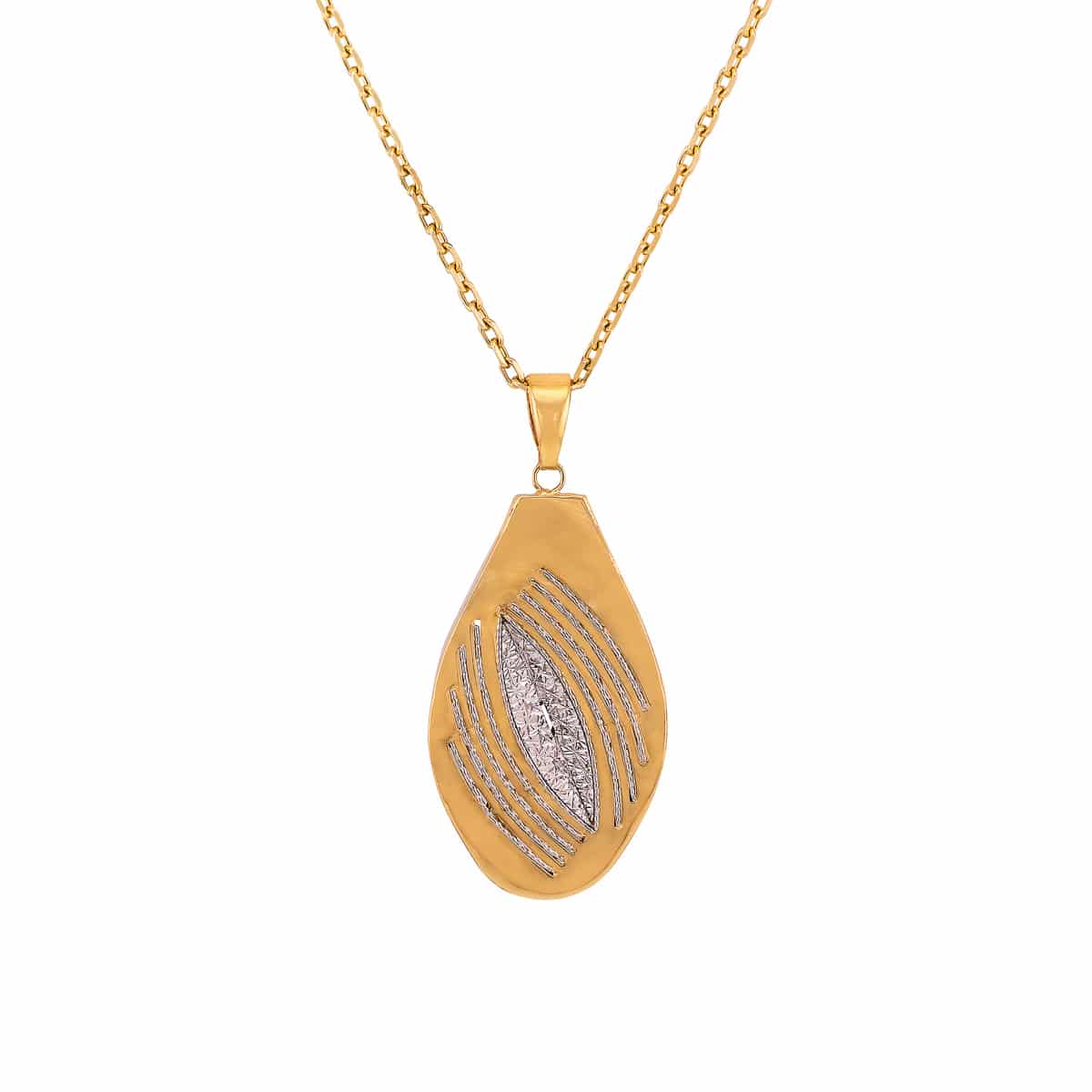 Owalny kształt zawieszki doskonale podkreśla jej smukłą formę, a zastosowane połączenie żółtego i białego złota tworzy efektowne kontrasty. Diamentowane zdobienia, które subtelnie podkreślają centralną część zawieszki, dodają jej niepowtarzalnego blasku i szlachetności. Gładkie, lśniące powierzchnie w połączeniu z teksturowanymi detalami tworzą kompozycję, która przyciąga spojrzenia i dodaje uroku każdej stylizacji.