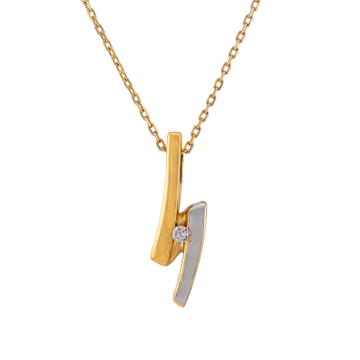 Na zdjęciu widzimy piękną zawieszkę, której subtelna asymetria i delikatne linie nadają jej nowoczesnego charakteru. Żółte złoto idealnie komponuje się z chłodnym blaskiem białego złota, tworząc elegancki kontrast. Centralnie osadzona cyrkonia, o doskonałym szlifie, przyciąga wzrok swoim niepowtarzalnym blaskiem, dodając całości luksusowego wykończenia.