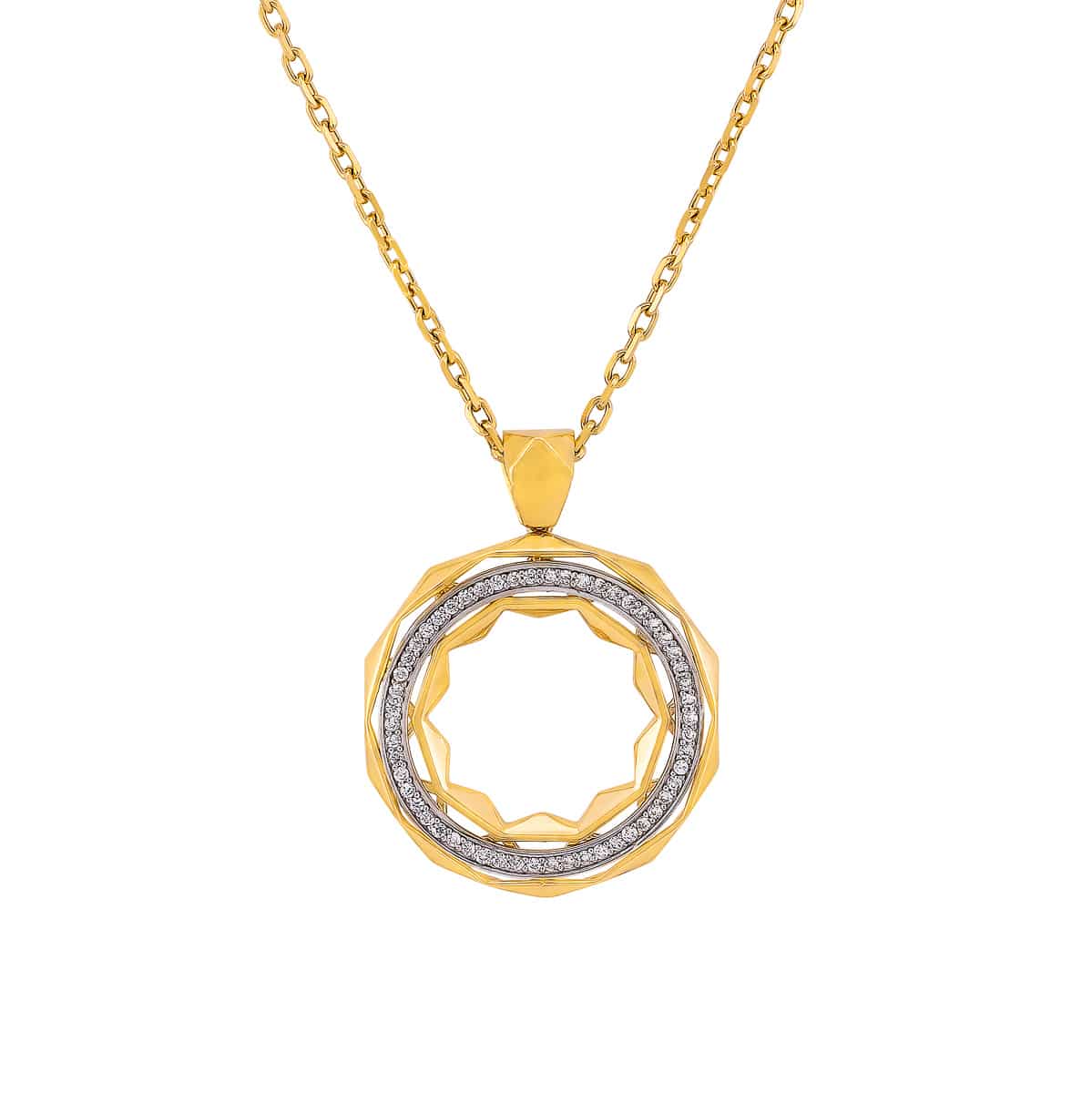Zawieszka wykonana jest z najwyższej jakości żółtego złota, które w połączeniu z białym złotem tworzy harmonijną całość. Centralnym elementem jest okrągły kształt, który przyciąga wzrok swoją perfekcyjną symetrią. Wewnątrz znajdziemy misternie osadzone cyrkonie, które lśnią niczym diamenty, dodając całości niepowtarzalnego blasku. Powierzchnia zawieszki jest gładka i lśniąca, co podkreśla jej luksusowy charakter.