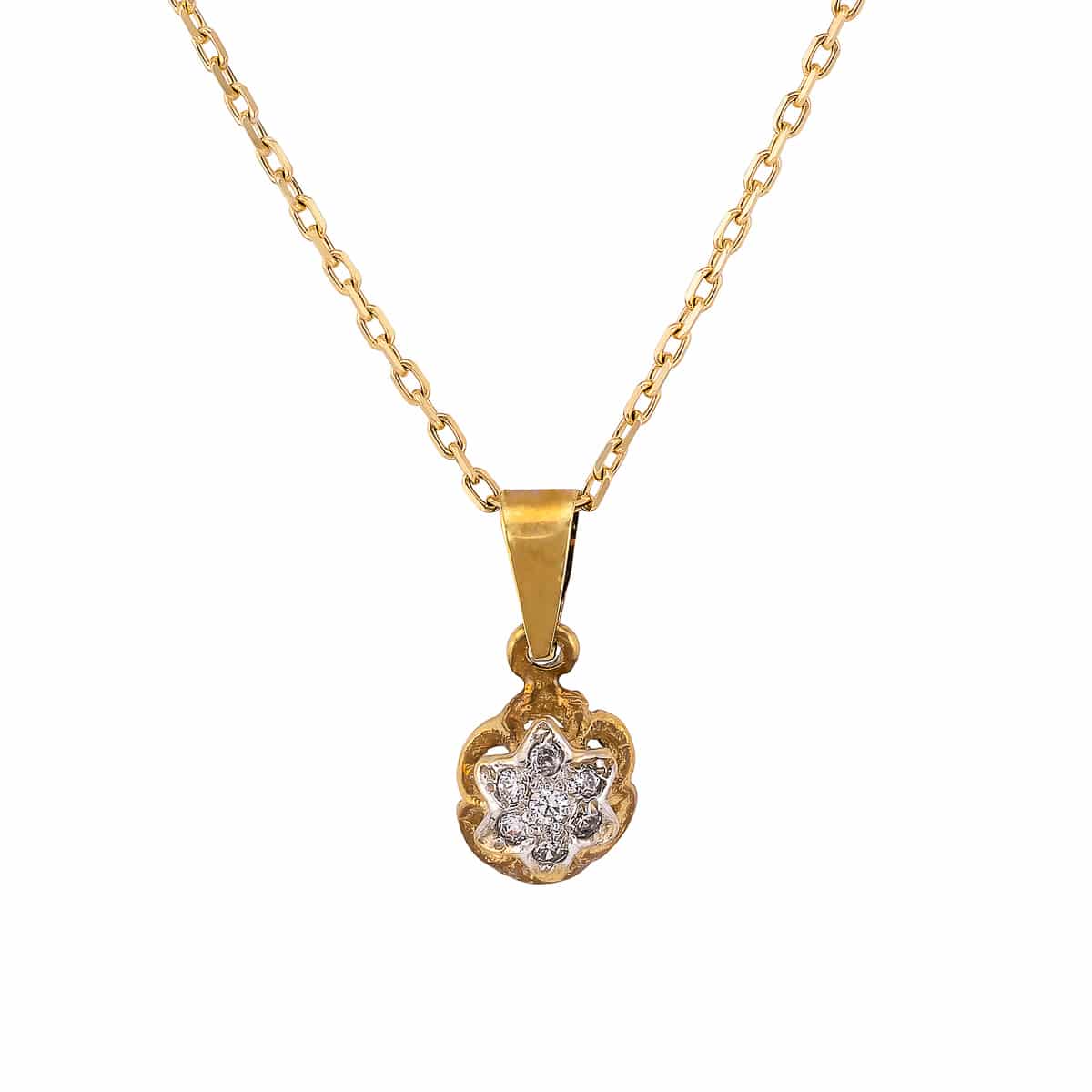 Zawieszka wykonana jest z połączenia żółtego i białego złota, tworząc harmonijną kompozycję kolorów. Centralnym elementem jest ażurowy kwiatek, który urzeka misternym wzorem. W jego środku lśnią drobne cyrkonie, które subtelnie odbijają światło, nadając zawieszce wyjątkowego blasku. Kształt kwiatu jest delikatny i pełen gracji, co czyni go idealnym uzupełnieniem każdej eleganckiej stylizacji.