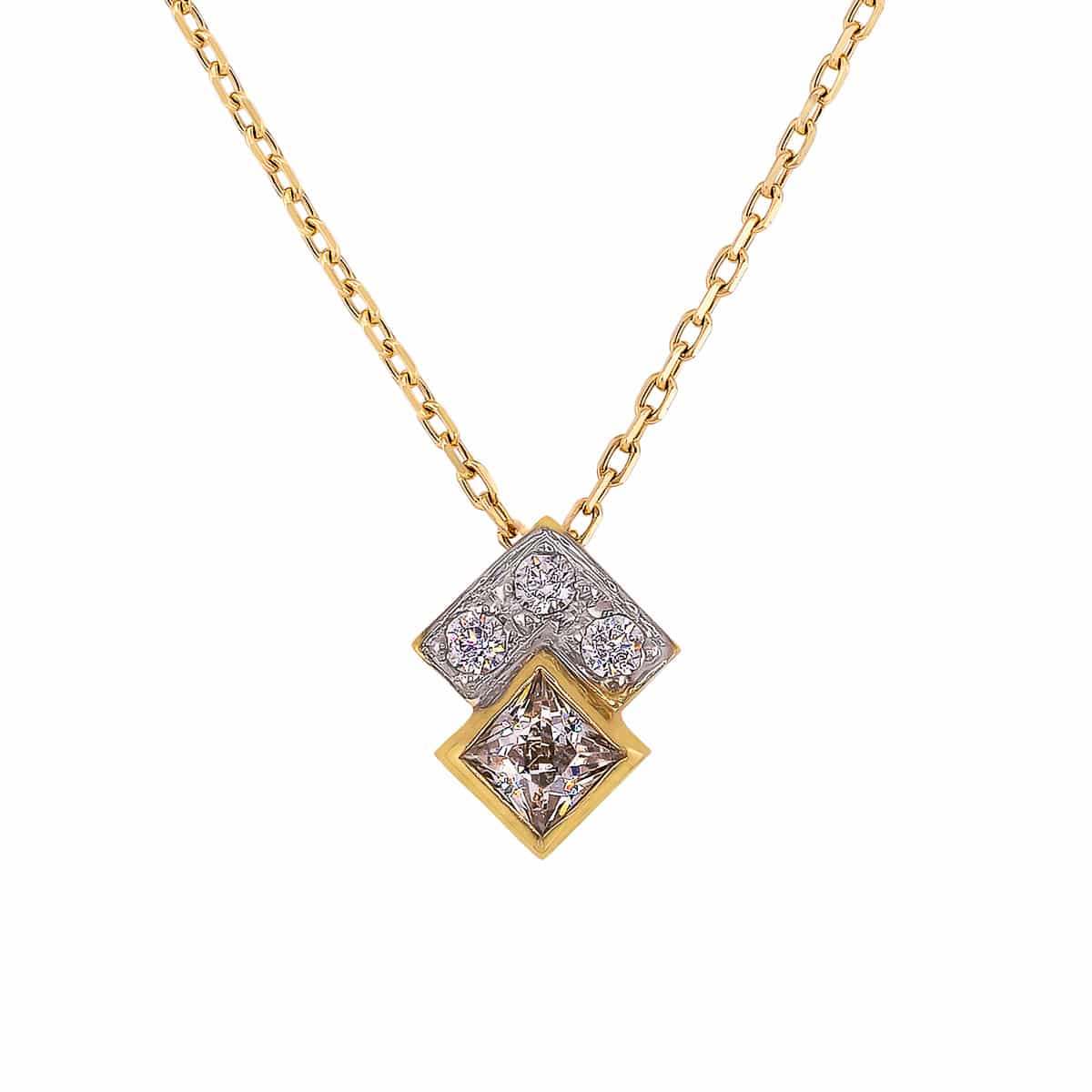 Zawieszka wykonana jest z dwóch odcieni złota – ciepłego żółtego oraz chłodnego białego. Te kontrastujące barwy tworzą harmonijną całość, która zachwyca swoim wyglądem. Geometryczny kształt zawieszki jest jednocześnie nowoczesny i ponadczasowy, a precyzyjnie osadzone cyrkonie nadają jej olśniewającego blasku. Centralna cyrkonia w dolnej części zawieszki przyciąga wzrok, podkreślając elegancję całej kompozycji.