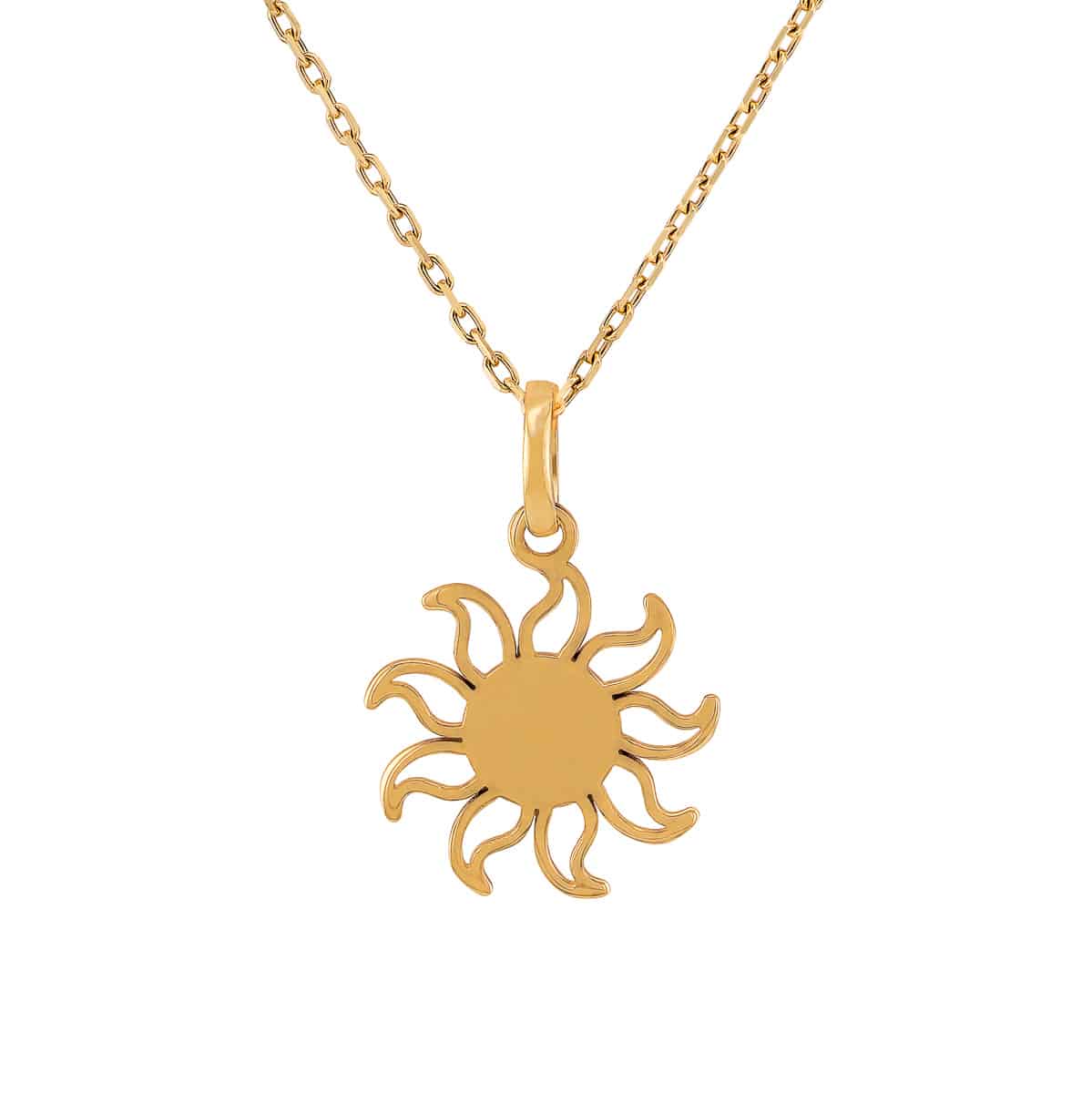Zawieszka wykonana jest z żółtego złota, które emanuje ciepłym, promiennym blaskiem. Jej kształt inspirowany słońcem przyciąga wzrok i dodaje energii każdej stylizacji. Ażurowy wzór jest lekki, a jednocześnie solidny, co czyni tę biżuterię idealnym wyborem zarówno na co dzień, jak i na specjalne okazje. Proporcje zawieszki są doskonale wyważone, co podkreśla jej elegancję i subtelność.