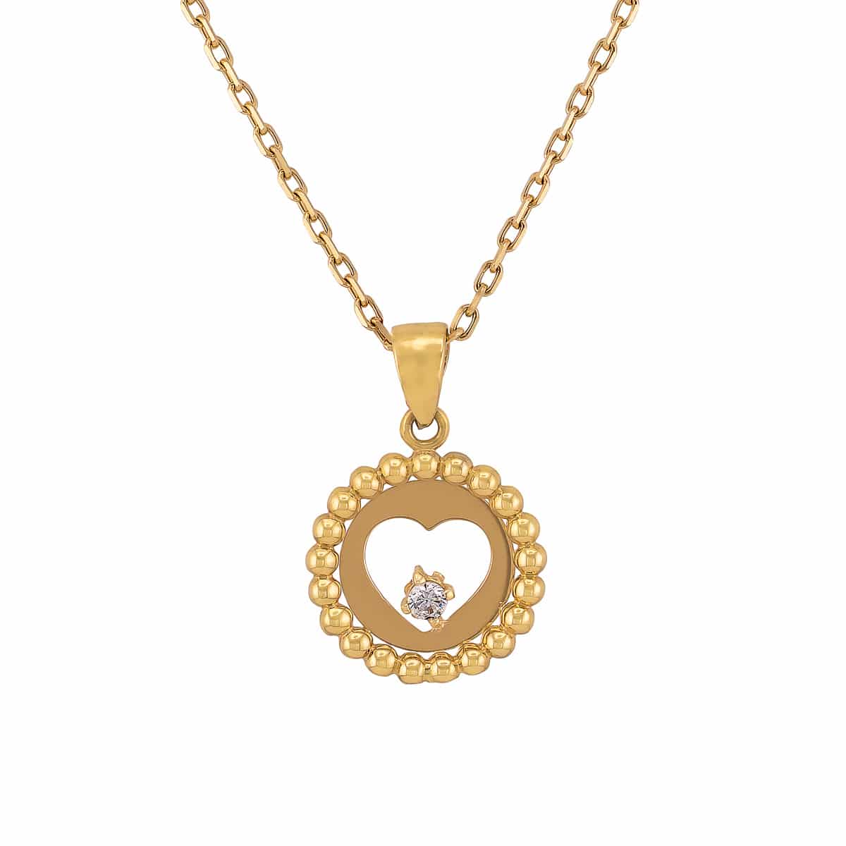 Na zdjęciu widać piękną zawieszkę wykonaną z żółtego złota, która emanuje ciepłym blaskiem. Jej centralnym elementem jest delikatne serduszko, wewnątrz którego umieszczona jest połyskująca cyrkonia, dodająca blasku każdej stylizacji. Całość otoczona jest misterną oprawą z kuleczek, które tworzą harmonijną kompozycję i dodają zawieszce unikalnego charakteru.