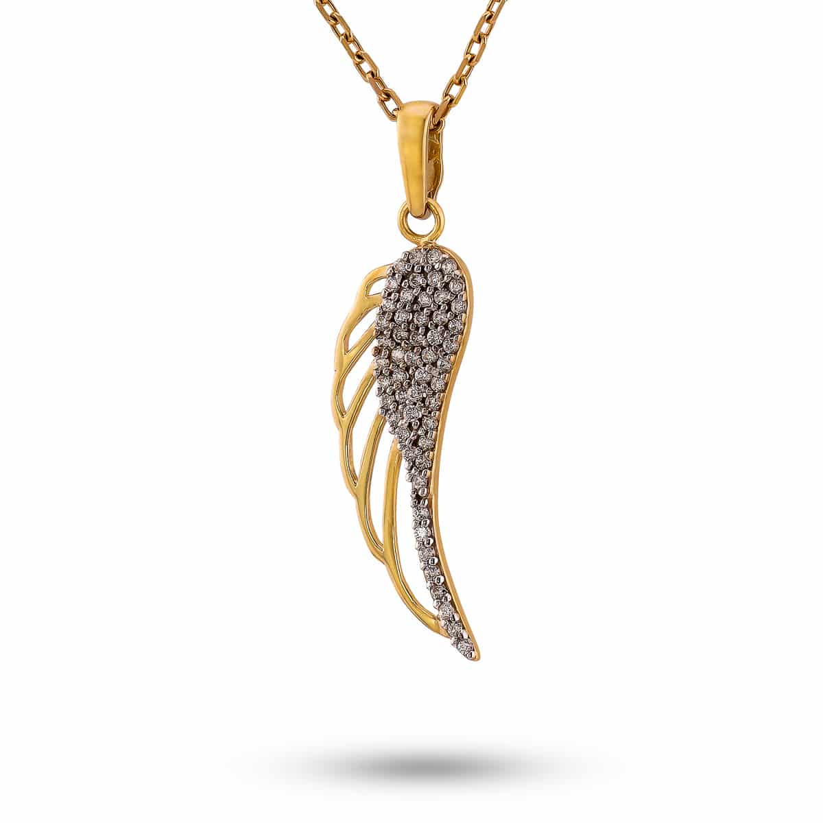 Zawieszka wykonana jest z żółtego złota o ciepłym, miodowym odcieniu, który doskonale kontrastuje z chłodnym blaskiem białych cyrkonii. Kamienie te, umieszczone centralnie na powierzchni skrzydełka, tworzą efekt migotania, dodając zawieszce niepowtarzalnego uroku. Delikatne kształty skrzydełka, z misternie wykończonymi konturami, nadają całemu projektowi lekkości i elegancji.