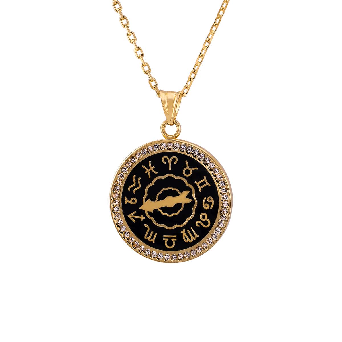Zawieszka wykonana jest z żółtego złota, które lśni ciepłym blaskiem, nadając całości elegancji i klasy. Okrągły kształt podkreśla symetrię, a czarna emalia tworzy kontrastowy, ale harmonijny motyw z symbolami zodiaku. Otaczające centralny wzór cyrkonie dodają zawieszce blasku i luksusu, przyciągając światło i uwagę z każdej strony.