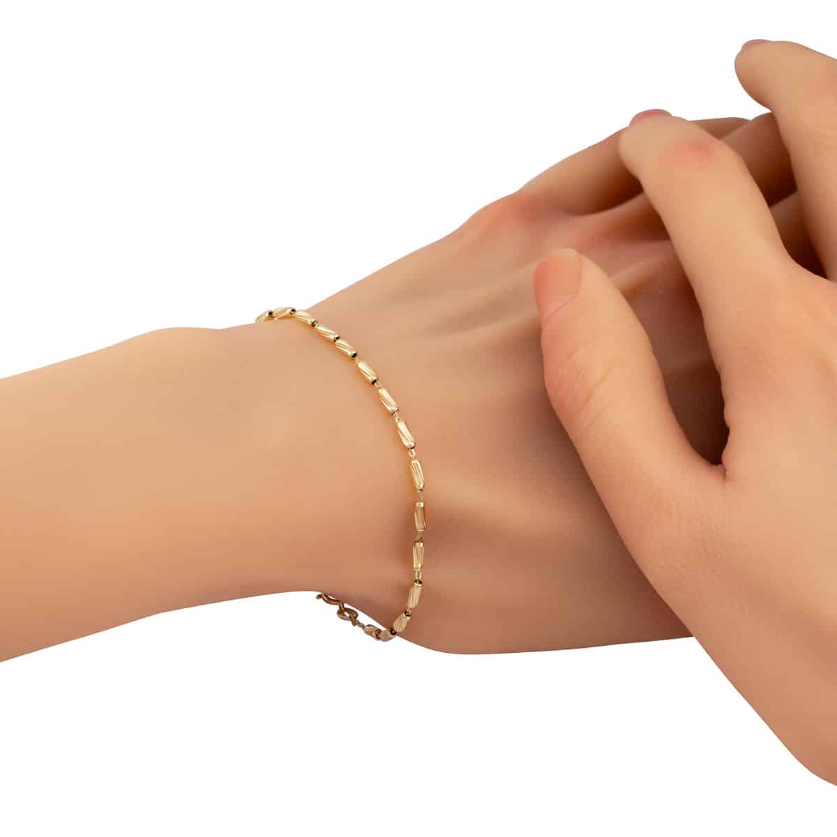 Subtelne diamentowane elementy rozmieszczone wzdłuż łańcuszka pięknie łapią światło, tworząc migoczący efekt, który zachwyca przy każdym ruchu. Podłużne elementy nadają bransoletce nowoczesnego, stylowego wyglądu. Całość jest precyzyjnie wykonana, a każdy detal świadczy o najwyższej jakości rzemiosła.