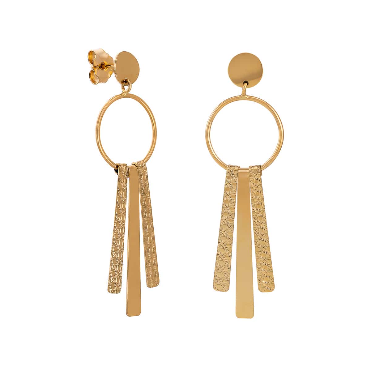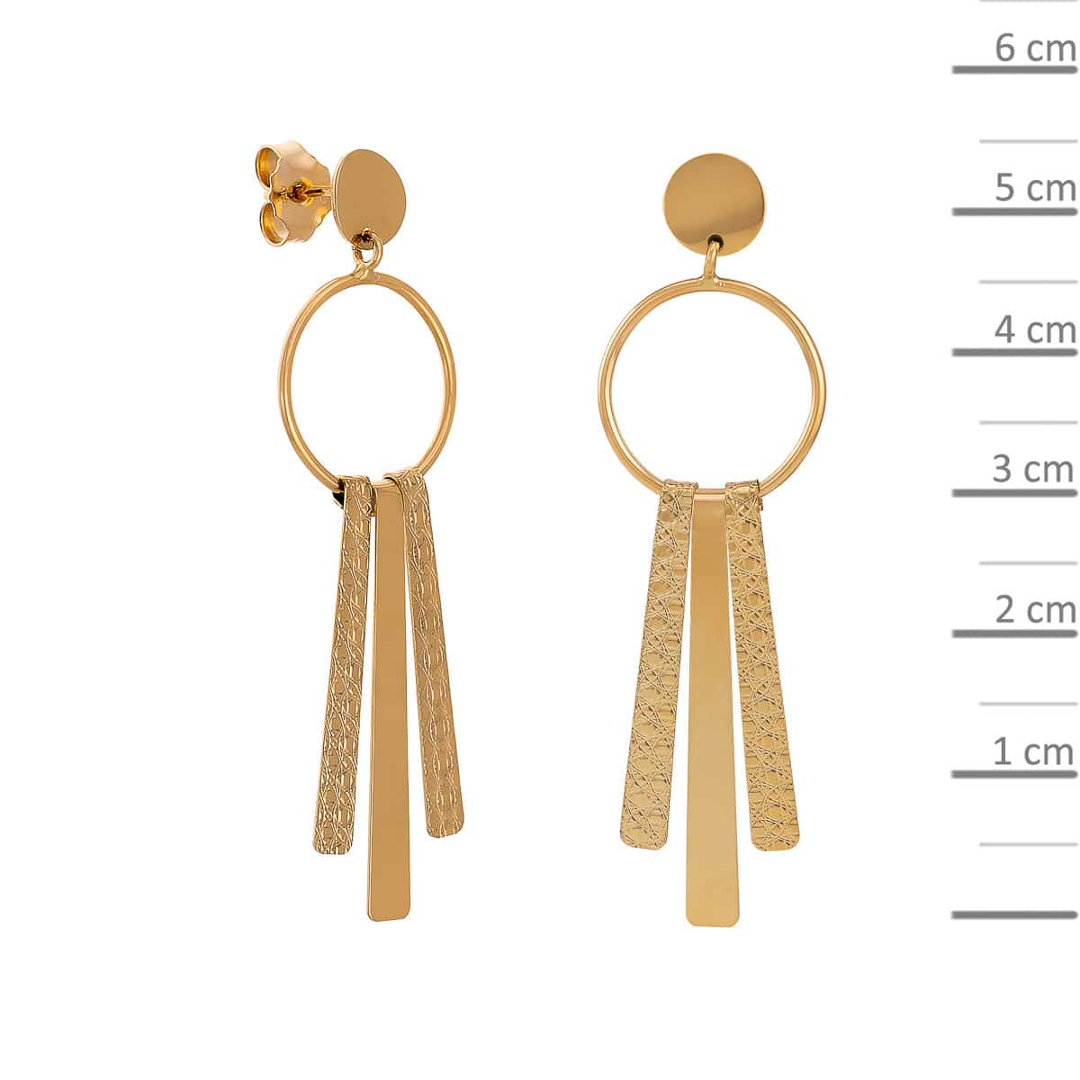 Kolczyki wykonane są z żółtego złota, które emanuje ciepłym, bogatym odcieniem. Wiszące elementy w postaci delikatnych blaszek różnią się fakturą – jedna z nich jest gładka, a druga posiada subtelne żłobienia, co wprowadza interesujący kontrast i głębię. Centralny okrąg, z którego zwisają blaszki, dodaje kolczykom harmonii i równowagi. Całość tworzy efektowną kompozycję, która z pewnością przyciągnie spojrzenia.