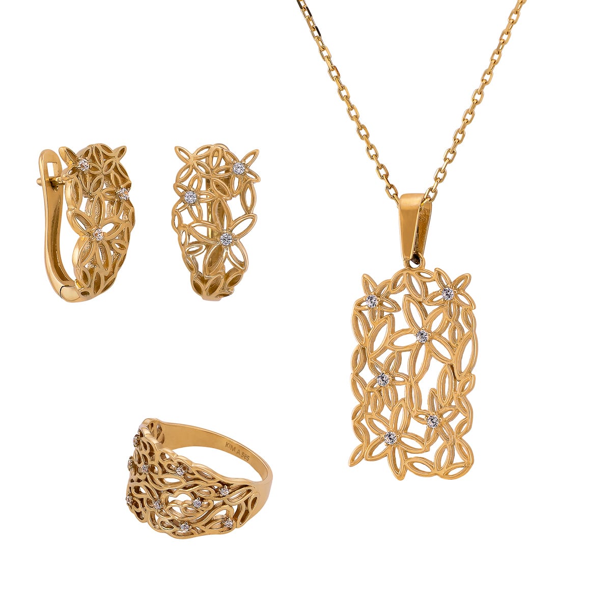 Komplet ażurowy biżuterii z żółtego złota z cyrkoniami pr. 858