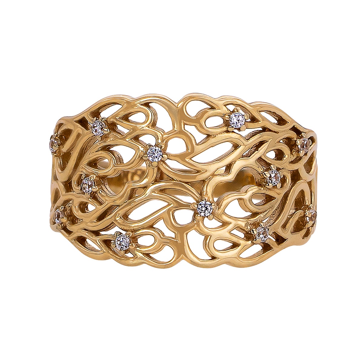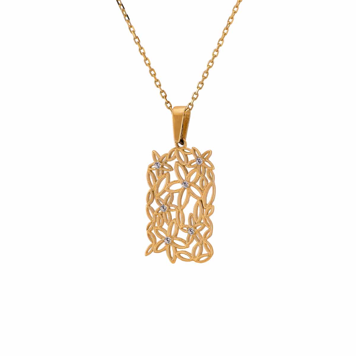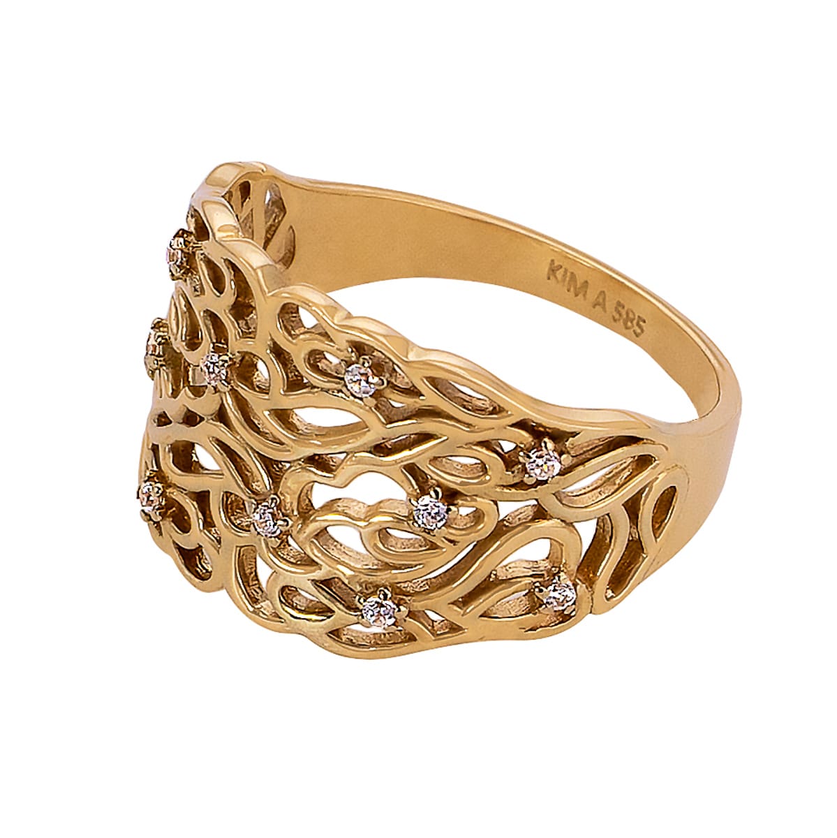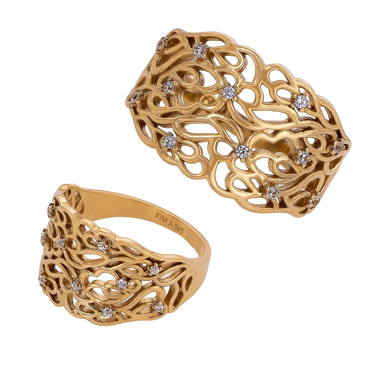 Wykonany z żółtego złota, ten komplet zachwyca swoim ciepłym, słonecznym odcieniem. Ażurowe wzory tworzą misterną kompozycję, która jest jednocześnie lekka i pełna wdzięku. Każdy element – naszyjnik, kolczyki i pierścionek – harmonijnie współgra ze sobą, tworząc spójną całość. Cyrkonie, subtelnie wkomponowane w zdobienia, dodają delikatnego blasku, przyciągając światło i podkreślając urok złota.