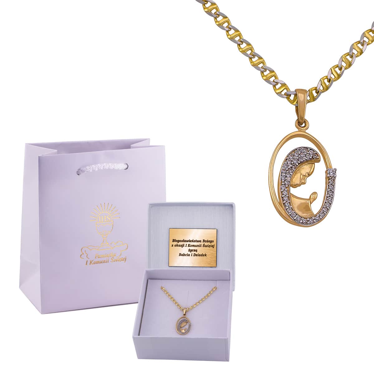 Złoty komplet wykonany jest z wysokiej jakości żółtego i białego złota, które tworzą harmonijną kompozycję. Medalik przedstawia delikatny wizerunek Matki Boskiej, otoczony subtelnymi zdobieniami z połyskujących kamieni, które nadają całości blasku i elegancji. Kształt medalika jest owalny, co podkreśla jego klasyczny charakter, a solidny łańcuszek o tradycyjnym splocie dodaje całości wyrafinowania.