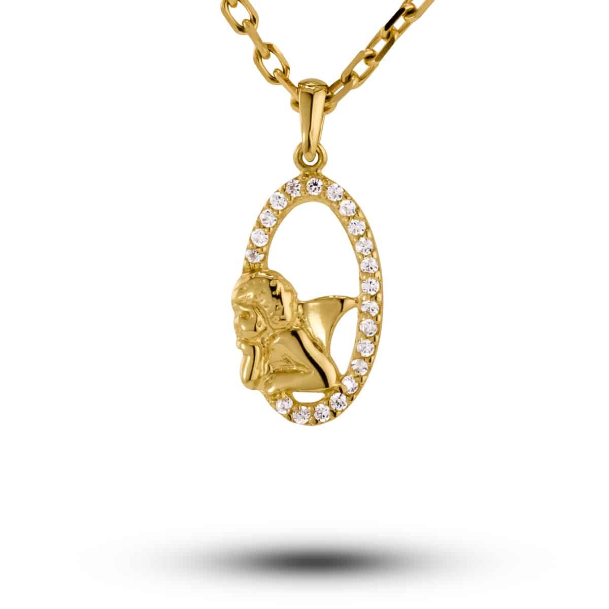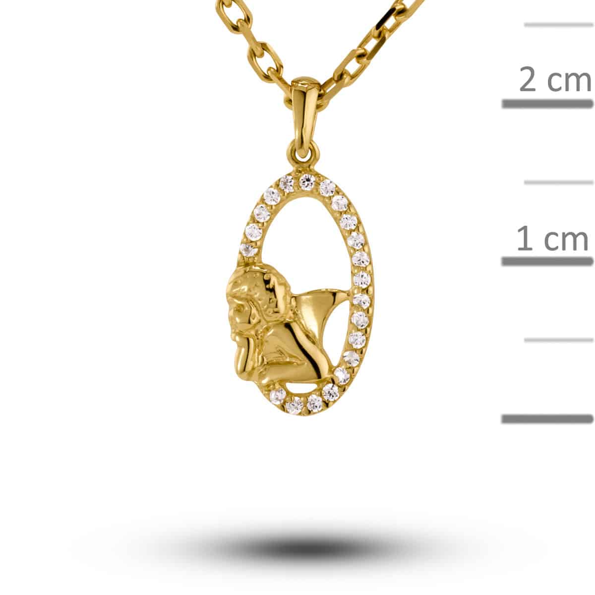 Złoty medalik został wykonany z najwyższej jakości żółtego złota, które mieni się ciepłym, bogatym odcieniem. Owalny kształt medalika jest nie tylko stylowy, ale także doskonale wyważony, podkreślając piękno i symetrię całej kompozycji. Na środku medalika znajduje się pięknie wyrzeźbiony aniołek, który dodaje całości duchowego znaczenia. Dookoła medalika błyszczą liczne cyrkonie, precyzyjnie osadzone, które odbijają światło, tworząc efektowny blask.