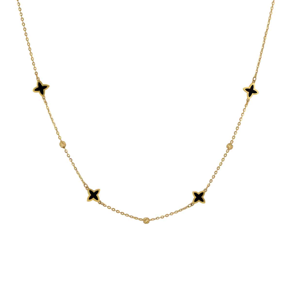 Naszyjnik charakteryzuje się subtelnym łańcuszkiem o splotu ankier, na którym umieszczono pięć misternie wykonanych elementów w kształcie koniczynek marokańskich. Wnętrze kwiatów wypełnione jest głęboką, połyskującą czernią (emalia jubilerska lub onyks syntetyczny), co tworzy luksusowy kontrast z ciepłym odcieniem złota.
