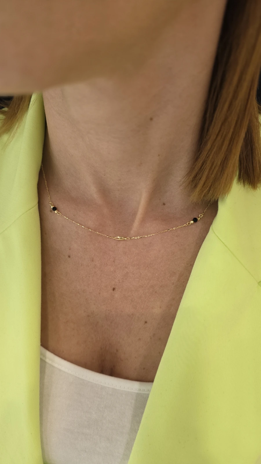 Projekt naszyjnika opiera się na rytmicznym rozmieszczeniu dekoracyjnych elementów na delikatnym łańcuszku typu ankier. Centralnym punktem są fasetowane paciorki z czarnego onyksu, które symbolizują determinację i pewność siebie. Ich głęboka czerń została zestawiona ze złocistymi detalami: