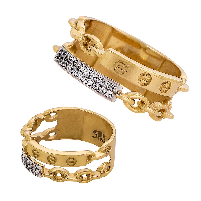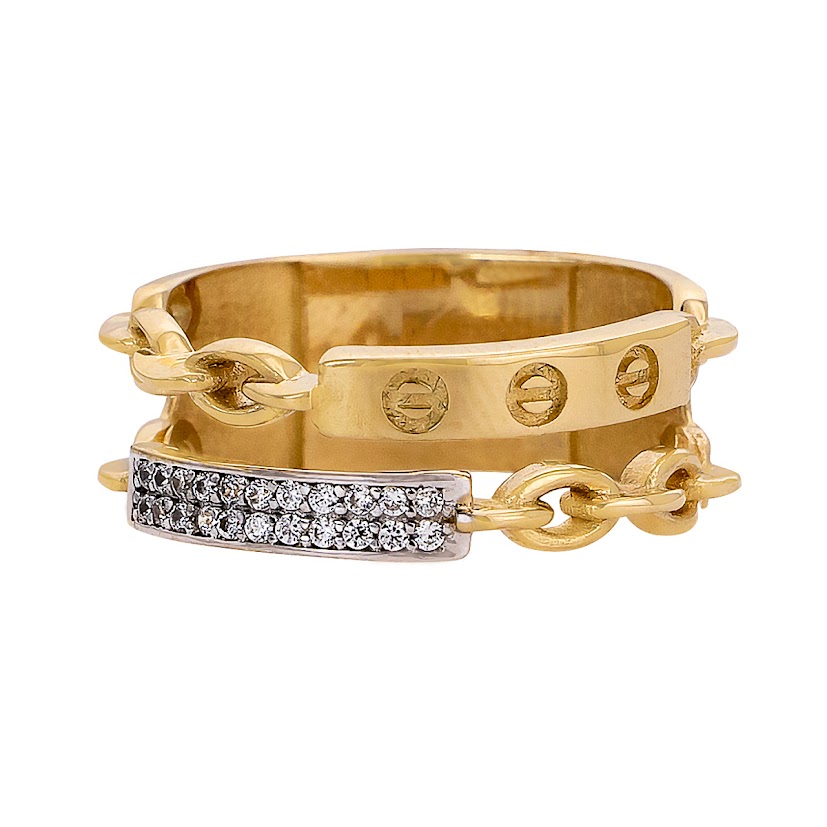Sercem projektu jest wielowarstwowa, szeroka konstrukcja, która łączy trzy unikalne pasma. Środkowy element zdobią precyzyjnie grawerowane detale, nawiązujące do kultowych motywów jubilerskich, nadając całości prestiżowego charakteru. Zewnętrzne brzegi to kunsztowny splot typu pancerka, w który subtelnie wkomponowano prostokątny panel z lśniącymi białymi cyrkoniami. Ta gra tekstur – od gładkiego złota, przez ażurowy łańcuch, aż po diamentowy blask – tworzy niezwykle dynamiczny i nowoczesny efekt.