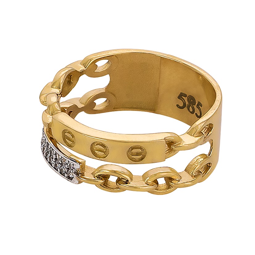 Złoty Pierścionek Szeroki – Motyw Łańcucha i Grawerowanych Detali pr. 585