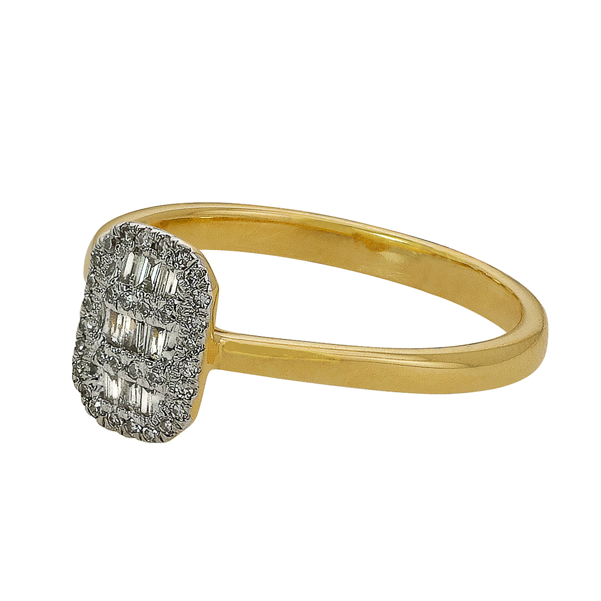 Sercem projektu jest prostokątna korona o zaokrąglonych rogach, wypełniona diamentami o dwóch różnych szlifach. Centralną część tworzą diamenty bagietowe, których lustrzane fasetowanie emanuje spokojnym, głębokim blaskiem. Zostały one misternie otoczone aureolą z klasycznych brylantów, które dopełniają całość iskierkami światła. Takie ułożenie sprawia, że korona pierścionka tworzy jedną, lśniącą taflę, która spektakularnie odbija światło przy każdym ruchu dłoni.